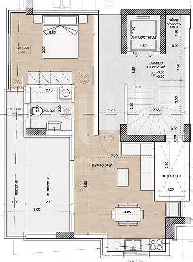 Papagou - Apartment 47sqm bedroom, levels 1, 1st, year built 2024, energy class A+, living room, hall, kitchen, bathroom, heating type: autonomous (heat pump), air condition, parking ground floor, quiet, luminous, unobstructed view view, storage space, solar heater, boiler, external thermal insulation, balconies, large balconies, elevator, thermal shut-off frames, double glazed windows, door screen, wood & tile floors, three phase electricity, night electricity discount rate, secure door, alarm, video doorbell, luxurious, under floor heating, ev charger, residential zone.
