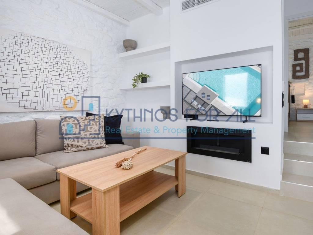 Villa For sale, floor: Basement, Ground floor (2 Levels), in Kythnos - Gaidouromantra. The Villa is 119 sq.m. and it is located on a plot of 1.313 sq.m.. It consists of: 3 bedrooms (2 Master), 3 bathrooms, 1 kitchens, 2 living rooms and it also has 4 parkings (4 Open). The property was built in 2024, Air conditioning, Solar water system, Boiler are also available, it has Wooden, Thermal brake frames with Double glazed - Energy Efficient windows, the energy certificate is: A+ and its floors are Tiles, Cement decorative coating. The property's status is: New development, it is close to Sea, Seaside, it has Sea, Mountain, Openness, Panoramic, Unobstructed view and it has East orientation. The Villa is Furnished, Luxury, Stone house, it is suitable for Holiday home, Business, Short term Rentals, Golden visa, Investment and it also has the following unique features and advantages: Window Screens, Electric Appliances, Energy fireplace, Internal staircase, Swimming pool, Garden, Security alarm, Security cameras, Fire extinguishers, Smoke detector, Internet, No shared expences, BBQ, Sattelite Receiver, Safe Box, Automatic watering, Grass. Price: €550.000. KYTHNOS FOR ALL Ε Ε, contact phone: 6980768722, email: info@kythnosforall.gr, website: www.kythnosforall.gr