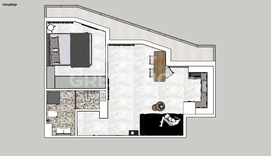 Thessaloniki - Flatlet 43sqm fully furnished, bedroom, upper floor, fully renovated, year built 1972, energy class E, living room, kitchen, bathroom, heating type: autonomous (natural gas), air condition, quiet, internal plot, painted, balconies, elevator, synthetic frames, double glazed windows, ceramic tiles floors, secure door, investment property (return 3.84%), short term lease, close to metro/train (up to 100m), close to banks (up to 100m), close to bus stop (up to 100m), close to super market (up to 100m), close to school (up to 100m), close to sea (up to 100m), close to park (up to 100m), close to square (up to 100m), close to market (up to 100m).