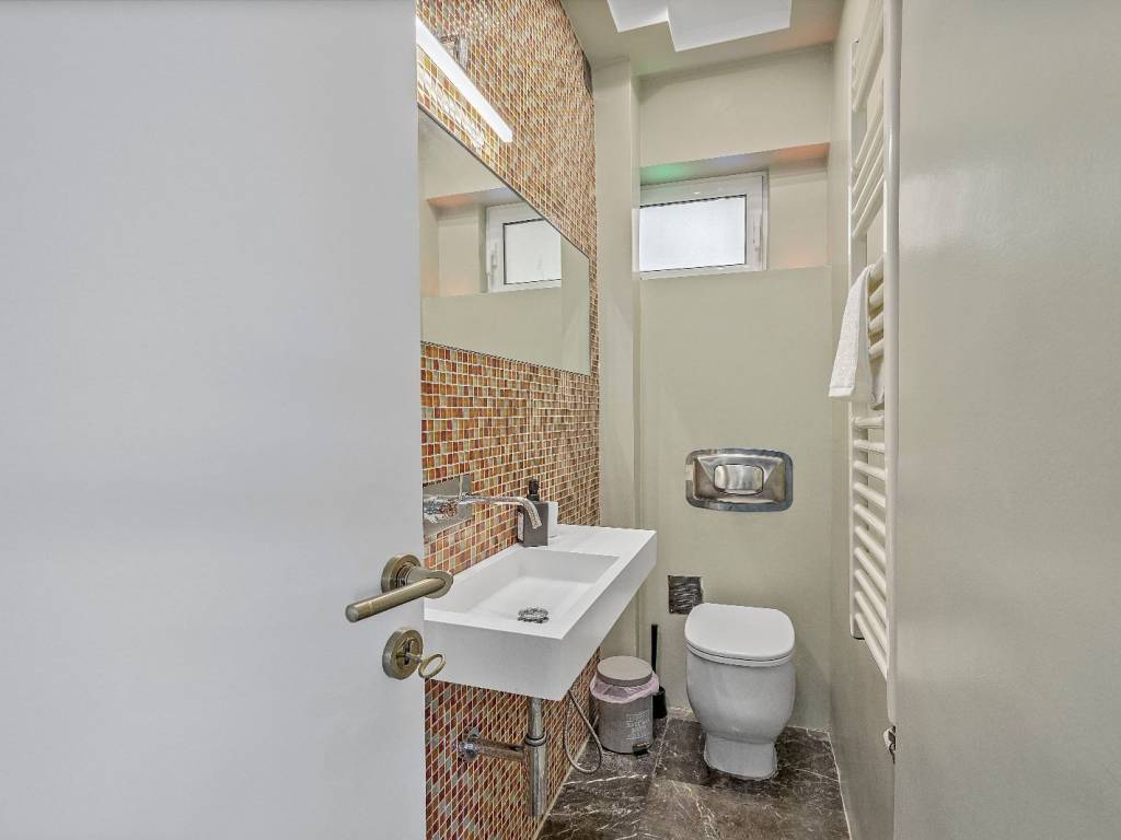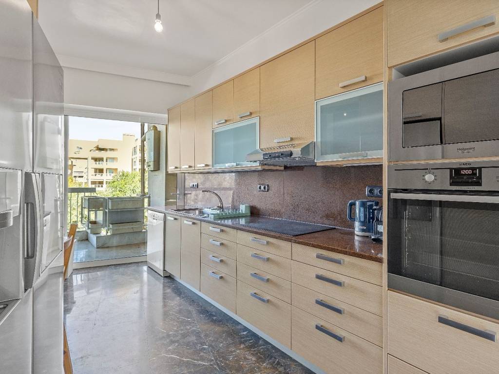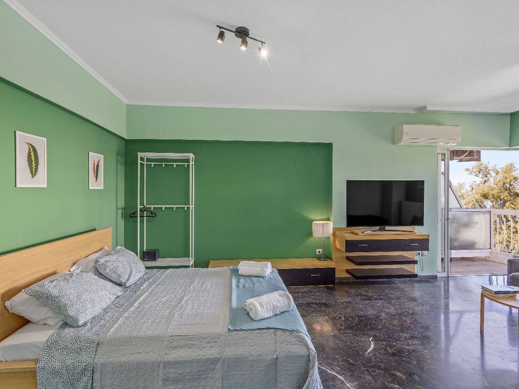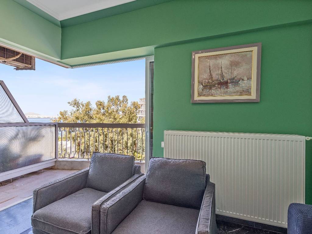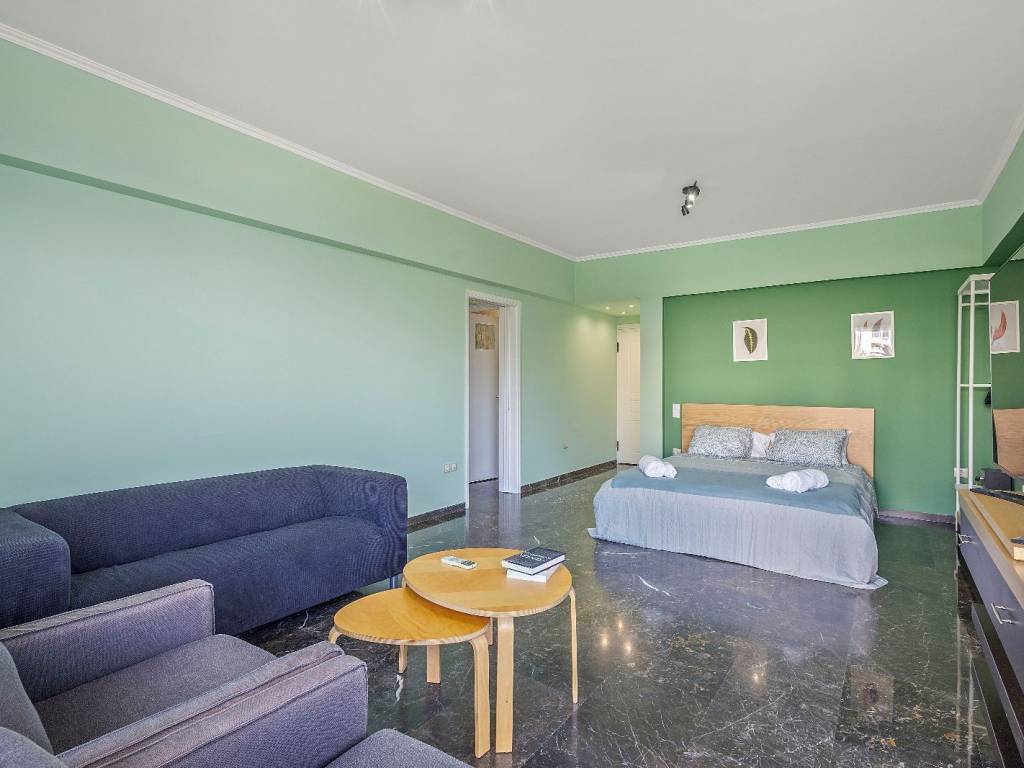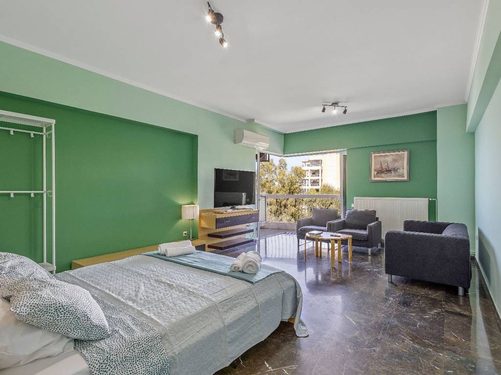 Luxury studio renovated in Alimos, with sea view, 4th floor with elevator. It has 1 open space with double bed and sofa, desk and chair, 1 shower room with washing machine and a WC, flat screen Smart TV, wifi, fully equipped kitchen, balcony on the quiet street. The accommodation is non-smoking and offers air conditioning, cooling and heating. Suitable for medium-term rental. The Edem Tram Stop of the metro is a 5-minute walk from the apartment.