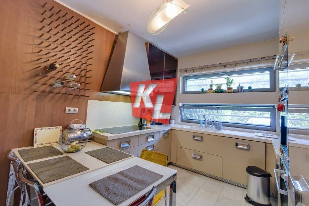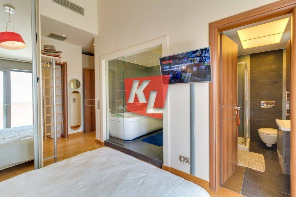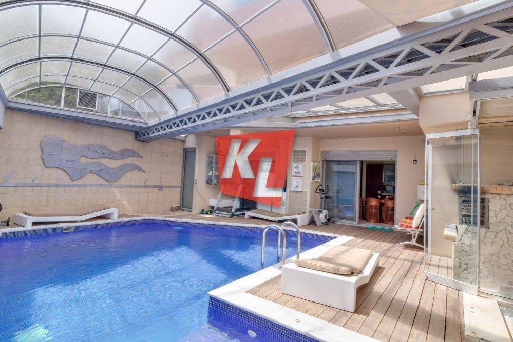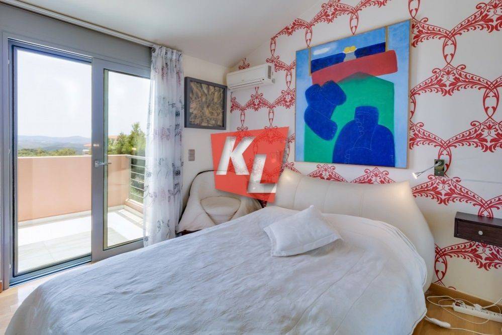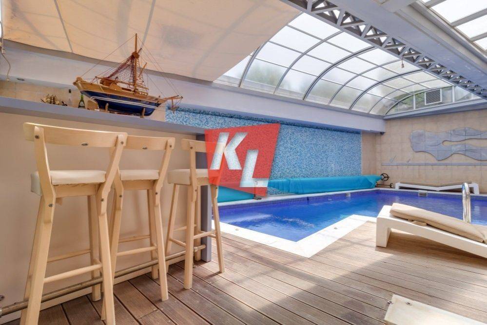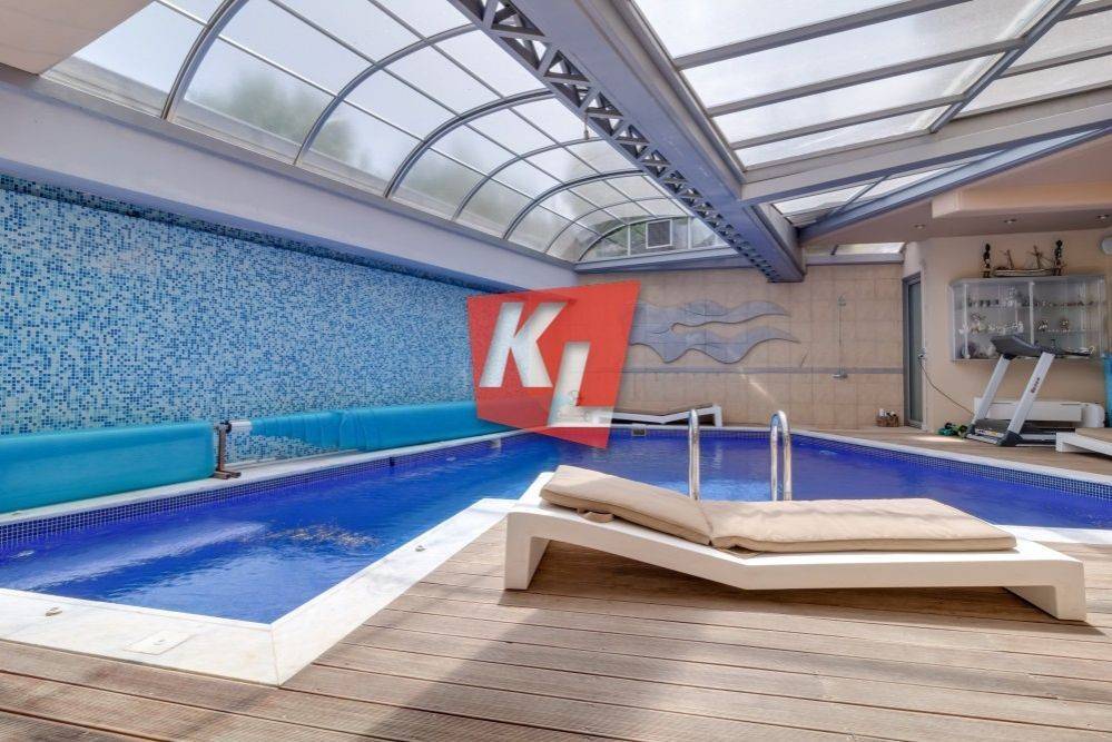 Penteli, Daou Penteli: Νewly built house 360sq.m. 3 levels with indoor heated pool for sale. It consists of 2 houses that have been joined and therefore has two entrances and two marble stairs that connect the three levels with an internal elevator. On the A ground floor there is the dining room, living room with marble energy fireplace, office, kitchen, entrance wc, balconies along the floor plan of the space at 120 m2. On the B ground floor there is a living room with home cinema system for showing movies, marble energy fireplace, kitchen for pool service, two master bedrooms, pool area with independent wc, bar with all equipment (cabinets - refrigerator). The pool area consists of the pool of approximately 70 m2 with hydromassage, heated for the winter, covered by a metal canopy throughout the space that opens in summer to turn the 100 m2 space into an outdoor area. Also next to the pool area with windows opening - accordion, there is a terrace of 50 m2 for the use of the outdoor dining area. The barbecue is located in the indoor area of the pool, for use at any time of year. The area of the B ground floor (120 m2), is located on the same level of the pool and the terrace, and all bedrooms overlook the outdoor garden terrace. On the 1st floor 120 m2, which includes 2 master bedrooms, a small living room, an office space, a master bedroom with two bathrooms (one has a hot tub and the other a hydromassage shower). All rooms have balconies overlooking the sea. Price € 1200,000 Property code: # 3186