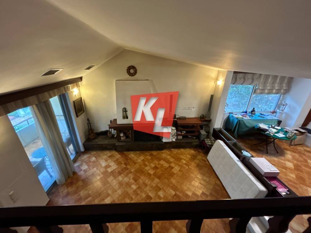 On the first level, the property features a very spacious and bright living room with fireplace, dining area, a large kitchen with built-in electrical appliances and a casual sitting area, a WC, as well as an elegant open mezzanine with wooden railing, ideal for use as a home office or library. Large wraparound balconies extend throughout this level.