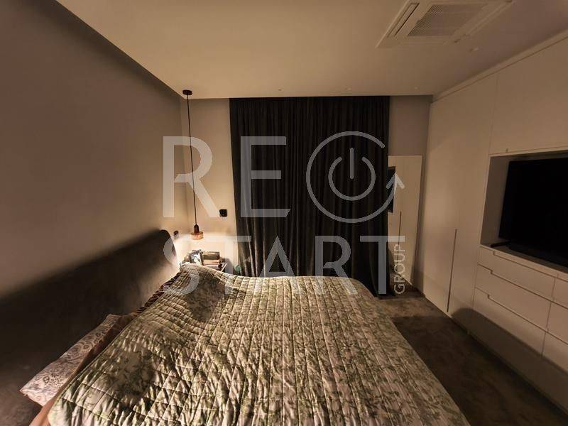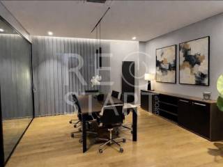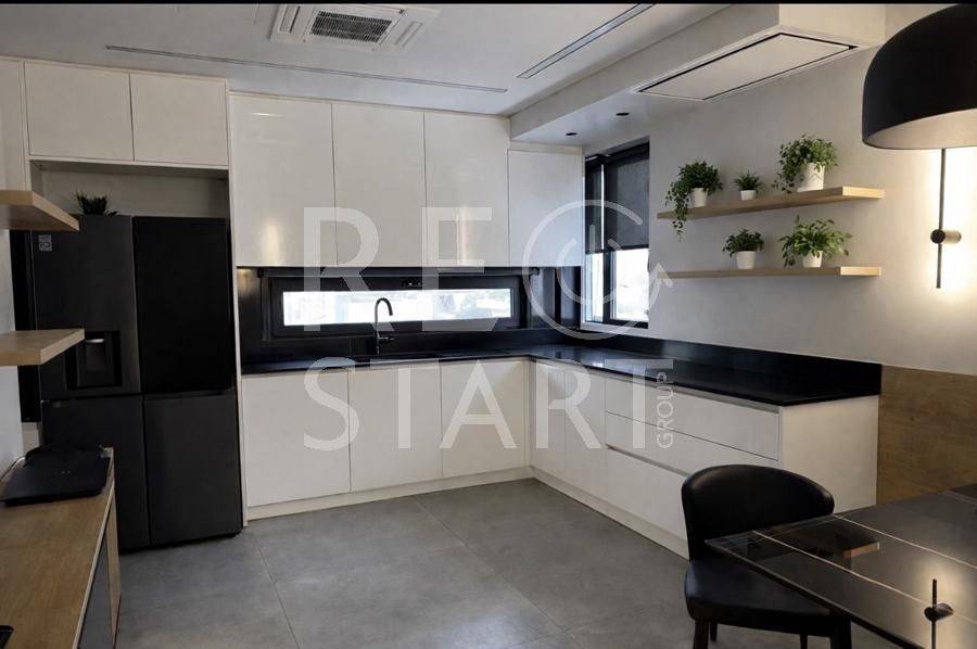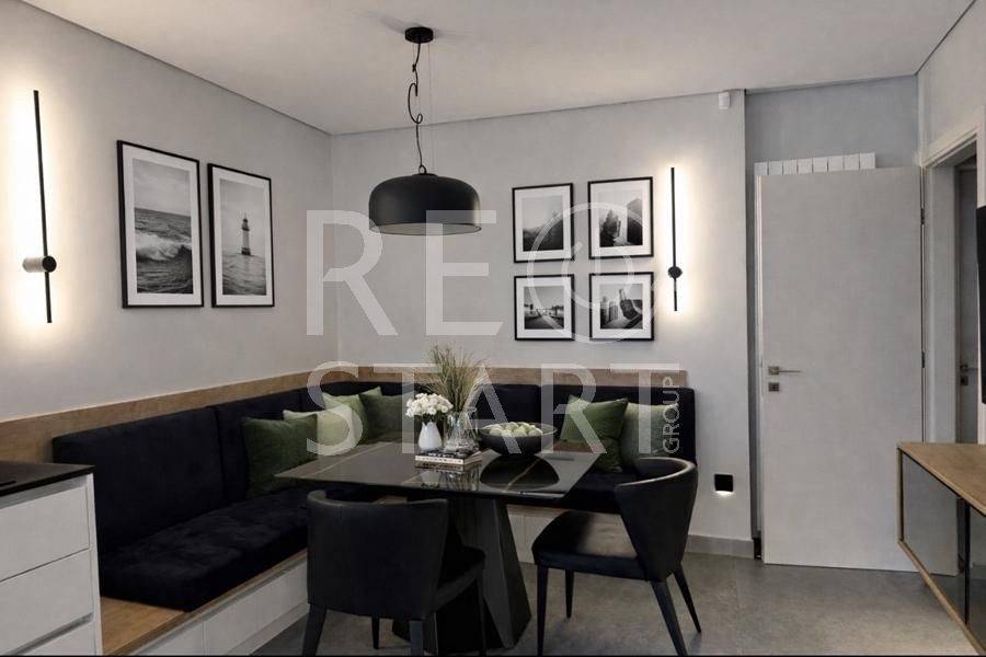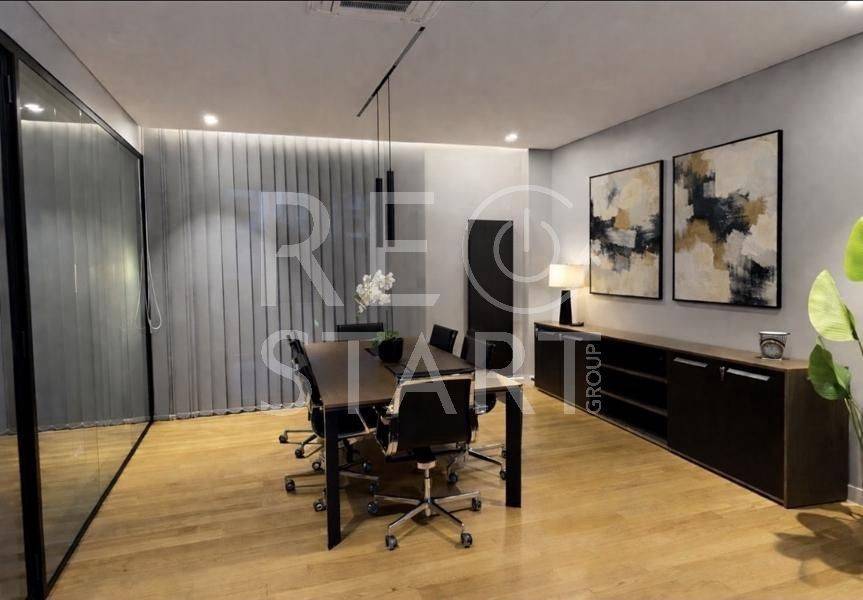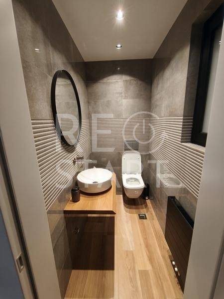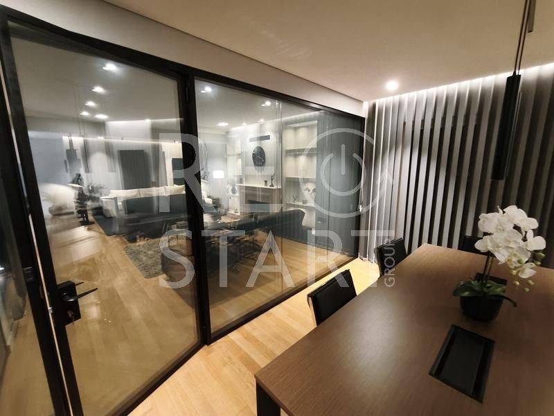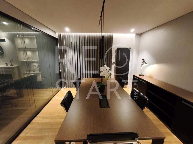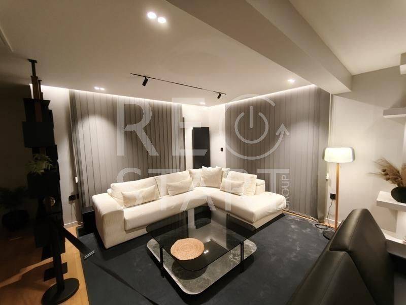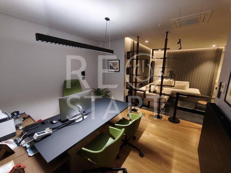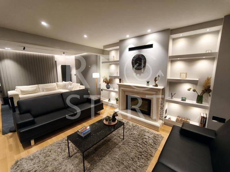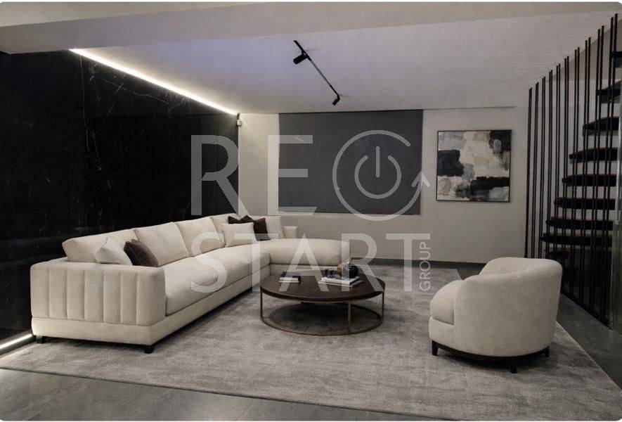 This is a contemporary maisonette with a neat living room with a warm atmosphere. Modern, minimalist with discreet luxurious touches — ideal for a residence with an emphasis on comfort and aesthetics. Central fireplace with visible frame/mantle, placed between symmetrical built-in shelves with night lighting (spots), which add decorative and functional lighting. In the foreground there is an office and a reception/work area. This is a modern, elegant professional space/office with a minimal aesthetic. Open space with warm wooden flooring and a neutral color palette (gray, black, natural wood). Centrally, a meeting room with a long table and chairs — capacity for approximately 6–8 people — is distinguished, which is separated by glass walls, offering visual continuity but also privacy. Suspended staircase with a metal structure leading to the second level. This is a modern, open-plan kitchen/living area with a simple and elegant aesthetic. - White, glossy L-shaped kitchen cabinets with a black countertop. Kitchenette with integrated lighting under the cabinets that offers good ergonomics. Floor with large gray tiles, clean and modern look, functional, modern and carefully organized space, suitable for daily use. The bedrooms with a modern, minimal style. Large built-in wardrobes that occupy the entire length of the wall, with a built-in recess/place for a TV and drawers under the recess. Dry, hidden lighting/standard ambient lighting (low lighting) that gives a warm color tone to the space. An air conditioning unit (hidden type) and a clean, simple ceiling are visible on the ceiling. The bathroom is a modern, elegant and simple design with quality finishes. The overall feel is minimalist and clearly renovated/new: clean lines, a monochrome color palette and hidden lighting. Walk-in shower with clear glass without a curtain or door, with a single base and black/gray marble tiles. The bathroom has dark marble tiles on part of the wall, contrasting with a light floor. Table/recessed washbasin on a marble surface with an integrated wooden cabinet below. Oval mirror and wall-mounted faucet. Concealed/linear LED lighting on the upper part of the wall and a wall lamp near the mirror. Hanging shelves/accessories in the shower for soaps and sponges. Toilet partially visible behind the partition. Overall the bathroom gives an impression of luxury and functionality, suitable for a modern apartment or renovated house