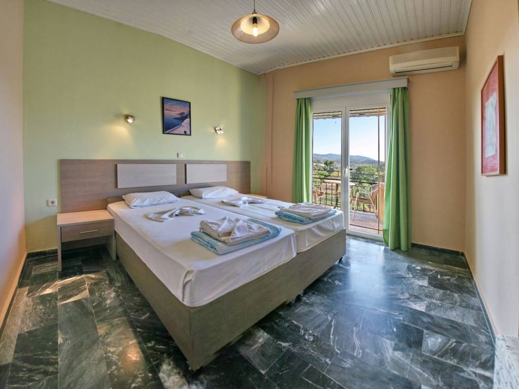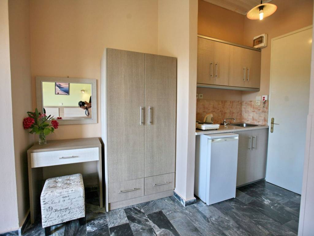 Studio/one-room apartment for rent from the end of May until October. It is located within a complex of rental apartments with a swimming pool, in a central spot in Anaxos, just 200 meters from the beach and 100 meters from the mini market, tavernas, and other shops. There is no parking inside the property, but there is a large public parking area by the beach.The price for the seasonal rental from May to October is €2,400 or 200 per month , paid in two installments in advance.
