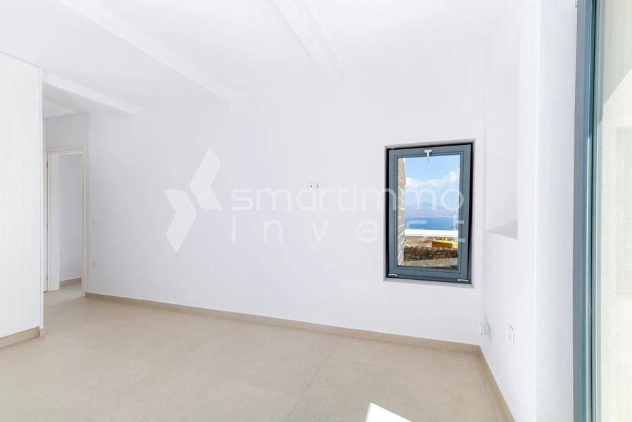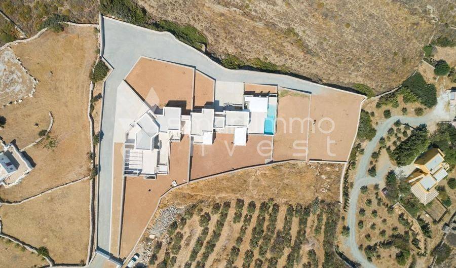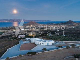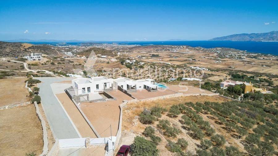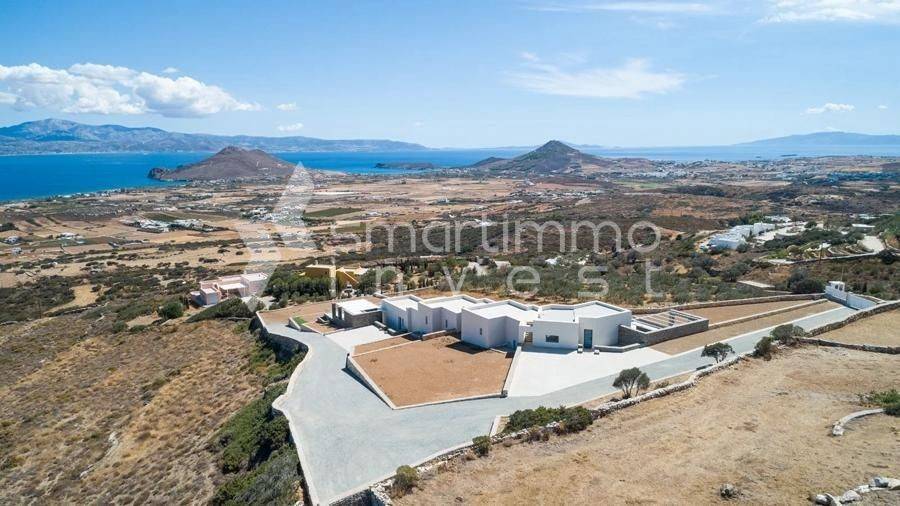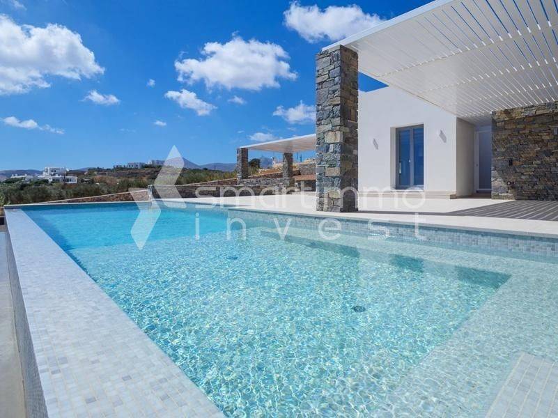 Luxury newly built villa of low energy consumption (A+) on the island of Paros, set in a prime hilltop location with a south-facing orientation and uninterrupted panoramic views over the Aegean Sea, including Mykonos, Naxos and Ios. This exceptional residence is a certified Passive House (A++) by an independent organization, setting new standards for sustainable and energy-efficient residential development on Paros. The villa has been designed, constructed and equipped with advanced passive energy management systems, ensuring superior living comfort and a stable indoor temperature throughout the year, regardless of weather conditions. Thermal comfort is achieved exclusively through the pre-heating or pre-cooling of fresh air, eliminating the need for conventional heating systems even during the coldest winter days. During the summer months, passive cooling techniques such as effective shading and night-time natural ventilation maintain a pleasantly cool indoor environment. High-quality materials and advanced construction technology guarantee consistently comfortable temperatures, excellent indoor air quality and a minimal energy footprint. The property consumes up to 90% less energy for heating and cooling compared to conventional buildings, with annual operating costs not exceeding €300 for year-round use. The architectural design follows the natural slope of the land and is arranged over two main levels with a total surface area of 234 sq.m., connected by small internal staircases, ensuring abundant natural light throughout all main living areas. The upper level of 138 sq.m. features a spacious and inviting living room with panoramic sea views, creating a serene atmosphere of privacy and relaxation. The bright, fully equipped kitchen with a large window is slightly elevated from the main space. This level also includes two comfortable bedrooms, one of which is a master with en-suite bathroom, as well as two bathrooms with sea views. The lower level of 79 sq.m. comprises two additional bedrooms, including one master, and two bathrooms, offering enhanced privacy and direct access to the impressive terrace and the large infinity swimming pool. This level also houses the technical control center of the Passive House systems within a spacious utility room. The outdoor areas are amphitheatrically designed and well protected from strong winds. The villa is surrounded by generous terraces totaling 165 sq.m. and a private garden of 1,292 sq.m., with irrigation supplied via a private borehole. A key highlight is the 40 sq.m. infinity pool with a depth of 1.80 m, ideal for enjoying summer moments with family and friends, complemented by outdoor speakers and a barbecue area. The panoramic views become even more captivating at night. The roof of the villa is accessible via an internal staircase and is ideal for sunbathing, offering uninterrupted views of the endless blue sea and surrounding islands in complete tranquility.