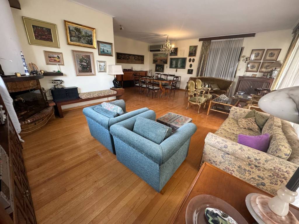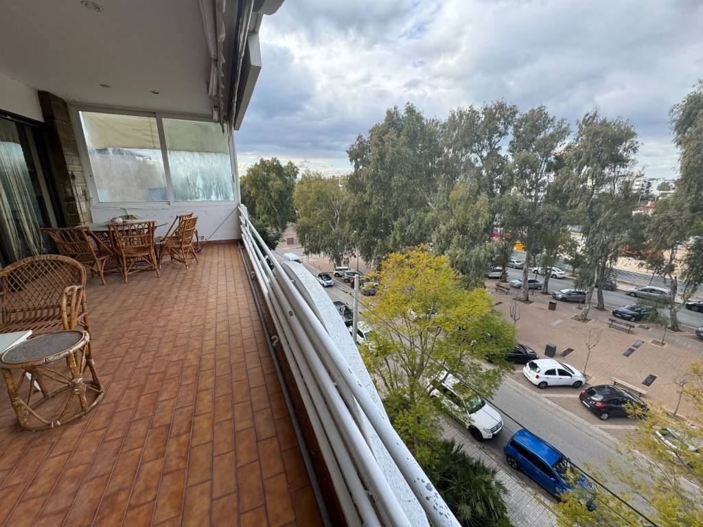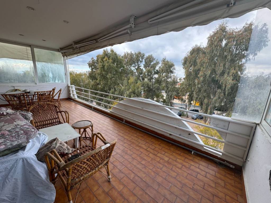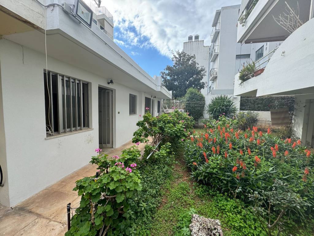 For sale is a unique bright 131 sq m fourth floor apartment, penthouse in the heart of Glyfada plus a garden house in the same apartment building, independent, 20 sq m. A property in a prime location in the center of Glyfada, 400 meters from the sea and next to shops, restaurants, gyms, supermarkets, beauty centers, etc. As we enter the apartment we encounter the living-dining room area, 45 square meters, particularly bright as it has openings (balcony doors and windows) on three sides, on the facade of the building but also on the right and left. There is a corner fireplace, oak floors, security door, air-conditioning and wood paneling in many places. The front balcony overlooking one of the most central streets of Glyfada is 22 square meters and offers an unlimited view. Entering the rest of the house we will see the hallway that is full of storage spaces and closets. On the right is the kitchen with access to this room on the balcony, we continue with two bathrooms of special aesthetics, a separate office room and finally we end up with the two bedrooms that adjoin the back balcony. Two spacious rooms with closets, oak floors and air conditioning. The back balcony is equally large and with a view of the mountain. In the house there is an underground storage room of 38 square meters and a separate studio of 20 square meters located in the garden at the back of the apartment building and is configured as follows: kitchen room, bathroom and an open space with closet. Along with the house, a closed parking space is also given in the apartment building for an additional fee.