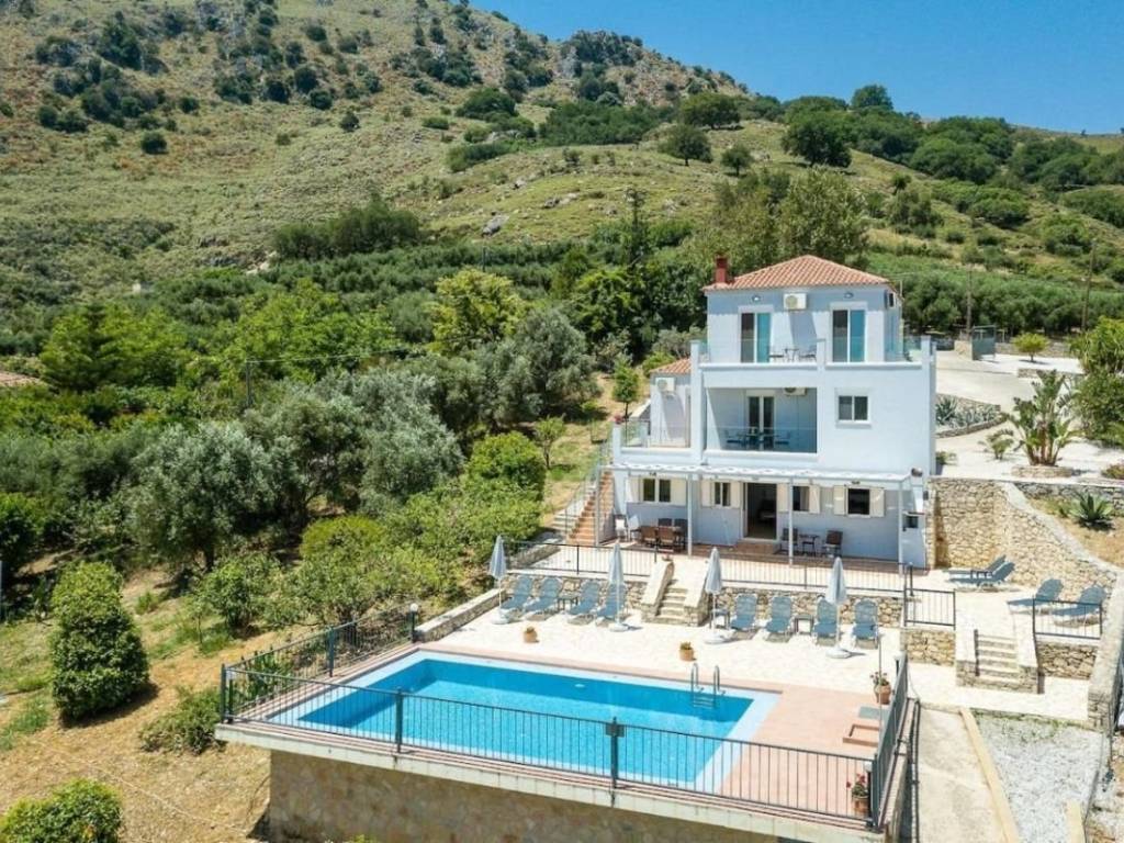 An additional bathroom serves this level. Outdoor Areas & Features The villa is surrounded by a stone-fenced garden planted with: Fruit trees Olive trees Nut trees Fig trees Banana trees Creating a private and tranquil natural oasis. Additional features include: Swimming pool with stone-paved sun terrace and sun loungers Tennis court Fully furnished and fully equipped – ready for immediate occupancy Technical Specifications Autonomous oil heating system with radiators Air conditioning units in all rooms Two solar water heaters (one for each unit) Water storage tank Aluminum window frames with double glazing Reverse osmosis water filtration system for high-quality drinking water Location Information Lake Kournas is the largest natural lake in Crete and lies in an enchanting landscape between the western slopes of the White Mountains and the fertile plain of Georgioupolis. The village of Kournas, with approximately 500 inhabitants, is located at an altitude of 200 meters and remains largely untouched by mass tourism, offering a truly authentic Cretan atmosphere. Distances: 2.5 km from Georgioupolis beach 43 km east of Chania 20 km west of Rethymno The wider area of Apokoronas is one of the most important ecosystems in Crete, with abundant freshwater resources throughout the year.