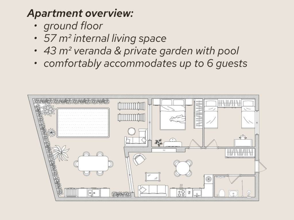 For sale: 2-bedroom apartment with garden and pool, 50 meters from the beach Total area of the property - 100 sq.m: 57 sq.m living area + 5 sq.m veranda + 38 sq.m garden with pool - 50 meters from the sea - Panoramic windows - Fully equipped modern kitchen with appliances (fridge, hob, dishwasher) - Air conditioning and heating system - Solar panels for water heating - Roof garden with lounge, BBQ and incredible sea view (only for residents) - Gym - only for residents - Indoor children’s play zone (only for residents) - Elevator - Storage rooms (extra fee) Prime Location: - Situated in the heart of Agios Nikolaos, just a 2-minute walk to the best beach — Ammoudi, and the vibrant promenade with restaurants and bars - All essential amenities such as supermarkets, cafes, healthcare facilities, and schools are within walking distance. - Distance to Heraklion International Airport - 60 km (40 minutes by highway) - Distance to the Golf Club - 9 km Completion date: Mid 2027