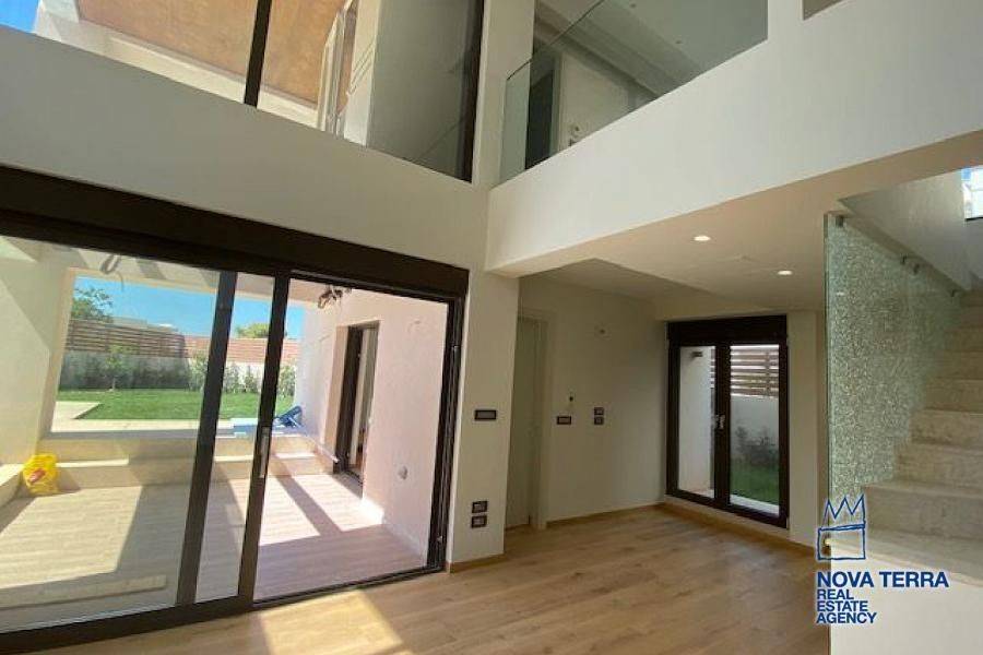 VOULA - VOULA KATO, Duplex / Triplex Apartment, 170 sq.m, on a plot of 223 sq.m, year built 2021, 3 rooms, Semibasement, Ground Floor, 1st, Various Characteristics: Balcony, Bath (3), Escalator, Fire Place, Garden, Kitchen, Living room, Playroom, Refurbished, Store Room, Swimming Pool, Toilet, Master Bedrooms: 3 Master Bedrooms, Flooring: Wooden floor, Heating: Air Conditioning, Autonomous Heating-central systm, Access road, Aluminium panels, Bright, Corner Block, Double-glazing, Facade, False ceiling, From Side to Side, Luxury, Maid Room, Minimal, Newly built, Painted, Residential area, Satellite TV, Screens, Security Alarm, Security Door, Tents, In perfect condition: : : : Parking area: Garage, Energy class: B+, property ID: 44744, www.nova-terra.gr