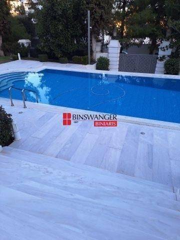 PALAIO PSYCHIKO: Located close to 2nd Square, an ultra-luxurious maisonette with a total area of 425 sq.m. featuring a private pool. The residence boasts luxurious marble finishes, a marble staircase, a four-person elevator, direct access to the beautifully landscaped garden and pool, independent central heating with its own boiler room, burner, tank, and connection to a generator, as well as central air conditioning. Finally, it offers two spacious self-service parking spaces in the basement, which is also equipped with a fire suppression system. More specifically, the maisonette is arranged as follows: Bright semi-basement with windows: Includes a large open-plan playroom with a fireplace, W/C, and a staff room with an en-suite bathroom. Ground floor: Features a comfortable living room with a ceiling height of 3.5 meters, an imposing fireplace, and an atrium. The dining area with its own fireplace is in an open-plan layout with the living room. There is a spacious, independent, luxurious kitchen with built-in appliances, a guest W/C, and a front-facing veranda with views of Mount Hymettus, the garden, and the pool. First floor: Comprises three bedrooms, including one large master bedroom with a fireplace, and two large master children`s bedrooms. Additionally, it includes a cozy sitting area and balconies. Second floor attic: Features a large, independent guest suite with direct access to a very large roof garden with marble flooring and stunning views. Monthly Rent: €10,000 (PROPERTY ID 7309 - AGENT ID 741) - BINSWANGER BINIARIS - CERTIFIED REALTORS - CONSULTANTS - VALUERS - PROPERTY MANAGERS, ESTABLISHED IN 1993, 1 Dimokratias Str. & Kifisias Ave., Neo Psychiko. Tel. 210 6829000. Web: www.binswangerbiniaris.com