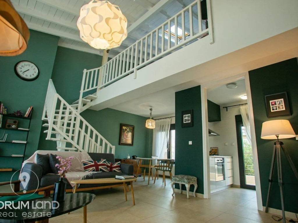 Pylaia for rent excellent Loft apartment 75 sq.m., 2 levels with view, luxurious construction in a three-story building of 2009, with elevator. It consists on the 1st level of a living room with fireplace, open kitchen, guest WC and on the 2nd level there is an open space bedroom with double bed, four-leaf wardrobe and spacious bathroom with bathtub. It has autonomous natural gas heating, large openings, new frames, fireplace, large internal height of tiled roof, minimal aesthetics. The view from the terrace is unobstructed. There is also a balcony at the back of the apartment. On the main level there is a storage room with a washing machine, while the kitchen has all the necessary electrical appliances. In front of the house there is comfortable, free parking. The address of the property is indicative. Code 23611 Contact Tel. +30 6948 177 232 Aristotelis Karagiannis and 2310 334 001.