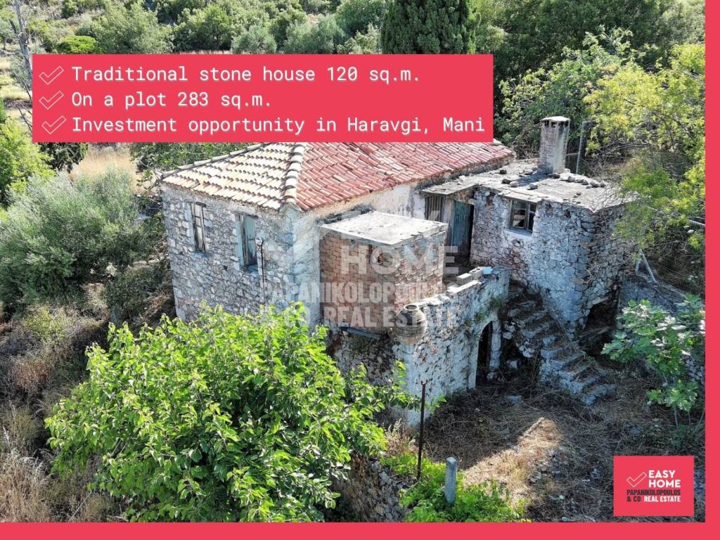 Stone detached house 120 sq.m. in Haravgi Avia. The property consists of 2 levels and is located on a plot of 283 sq.m. This traditional stone house is in need of renovation and has a lot of potential. Haravgi is a quiet, traditional village of Messinian Mani, 15 km from the center of Kalamata and 7 km from the wonderful beaches of the area. It is being sold at a very favorable price and after its relative restoration it can become a nice country house or a profitable investment property since the whole area of Mani has increased tourist traffic. For more information, please contact us. EASYHOME - Papanikolopoulos & Co Real estate agency Tel. +30 27210 22122 / +30 210 220 2962 E-mail: hello@easyhome.com.gr In order to find more properties, visit our website www.easyhome.com.gr At EASYHOME Real Estate, we are a real estate agency that provides comprehensive property management services. With a strong team of real estate consultants, engineers, architects, lawyers, and notaries, we inform, advise, and handle every matter concerning your unique property or help you acquire your own. We operate in Messinia, Attica, and selected locations across Greece. - The information of the listed properties has been taken from documents given to us or by declaration of the owners and our company bears no responsibility for any wrong information. - In order to indicate the property, documents and certificates, it is necessary to indicate the police ID and the A.F.M. according to Law 4072/11-4-2012 Official Gazette 86 A. - The location of the property shown on the map is for reference only. - Republishing, copying, reproducing, or sharing the advertisements and photos is strictly prohibited without the written consent of EASYHOME Real Estate.