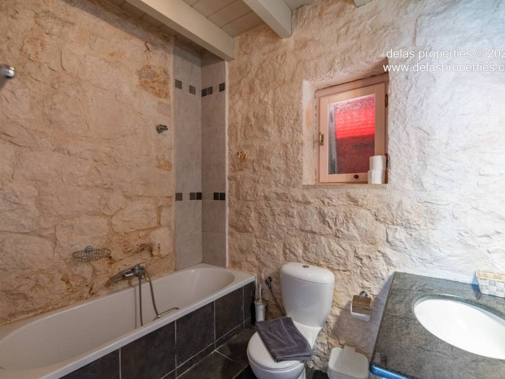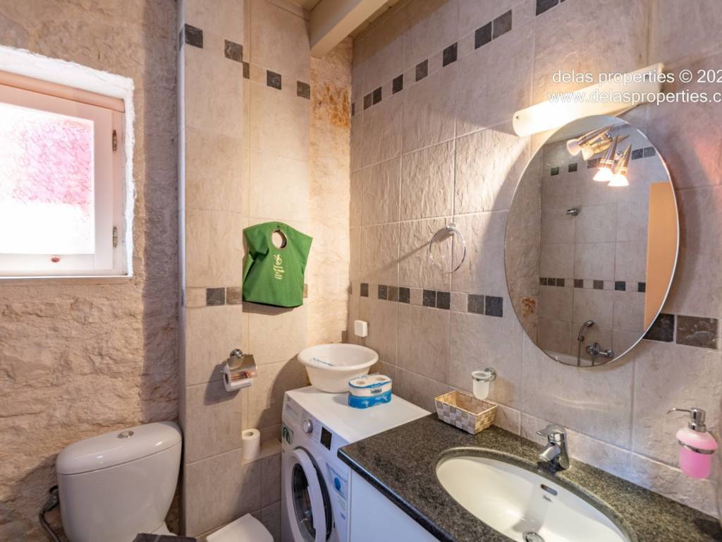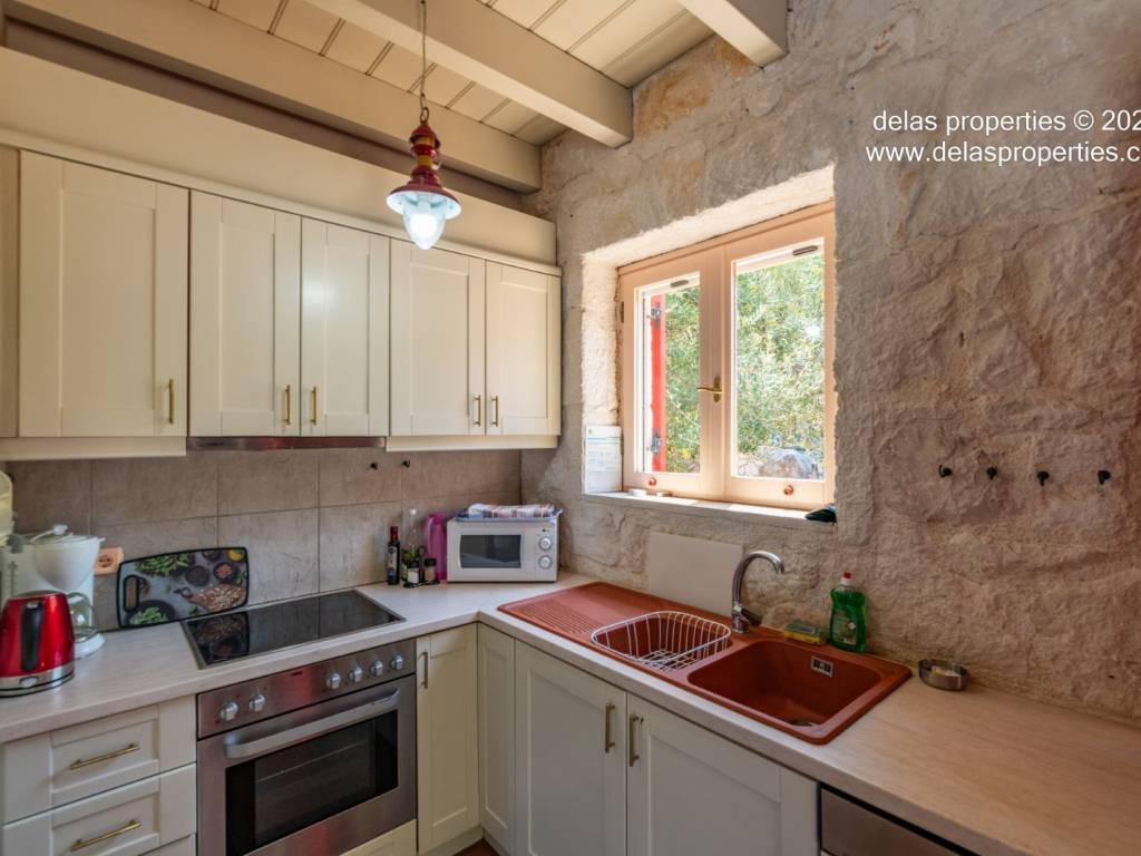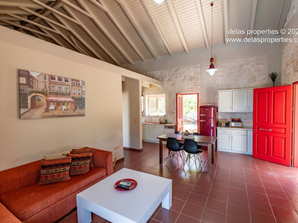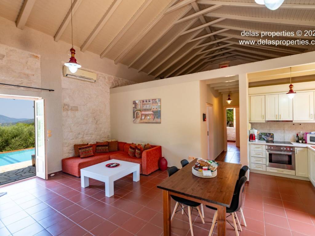 In the peaceful hillside area of Anavrytikes, just south of Vathy, this independent stone villa is offered for sale in a setting that brings together privacy, tranquillity and easy access both to the sea and to the island’s main town. The area lies outside the town plan, with scattered homes set naturally within the landscape rather than around a dense settlement. Vathy’s harbour and centre are approximately 3.2 km away, while Kaminia Beach is around 1.5 km from the property. This gives the villa one of the qualities many buyers look for on Ithaca: it feels quiet and removed, yet remains comfortably close to everything needed for daily life and summer living. The house is a single-storey stone-built residence of 76.63 sq.m., set within its own vertical ownership of 1,585.06 sq.m. The main living space is bright and welcoming, with an exposed timber roof that gives both height and volume to the sitting room and kitchen area. Stone, wood and direct openings to the outdoor spaces create an atmosphere that feels warm, calm and unforced. The villa offers two bedrooms and two bathrooms, one for each bedroom, a layout that works particularly well both for private use and for hosting family or guests. The house is well proportioned and easy to live in: not oversized, but comfortable and well balanced. The internal roof volume also offers potential for the future creation of a loft space, should a buyer wish to explore it. Outside, daily life naturally centres around the 29.46 sq.m. private swimming pool and the 38.44 sq.m. pergola areas, which create different zones of shade and outdoor sitting throughout the day. There is also a built-in barbecue and traditional wood oven, while the plot itself offers a good sense of separation and privacy without becoming difficult to maintain. Olive trees, stone retaining walls and the surrounding landscaping connect the house to its setting in a natural and understated way. In addition, the property includes a 49.50 sq.m. basement auxiliary space, a 34.55 sq.m. ground-floor storage building, and a 30.94 sq.m. underground water tank. Energy Performance Certificate: Category C. This is a home that does not rely on excess or display. Its appeal lies in the quality of its setting, its proportions, its privacy and the way it feels when you are there. For a buyer looking for an authentic stone villa on Ithaca, close to Vathy and close to the sea, yet set within a peaceful natural environment, this is a particularly attractive opportunity. Properties of this kind — with stone character, a private pool, independent vertical ownership and such a balanced location — rarely come to market. For more information or a viewing: Stavros Dellaportas – +30 6977683147 (WhatsApp & Viber) delas@otenet.gr www.delasproperties.com