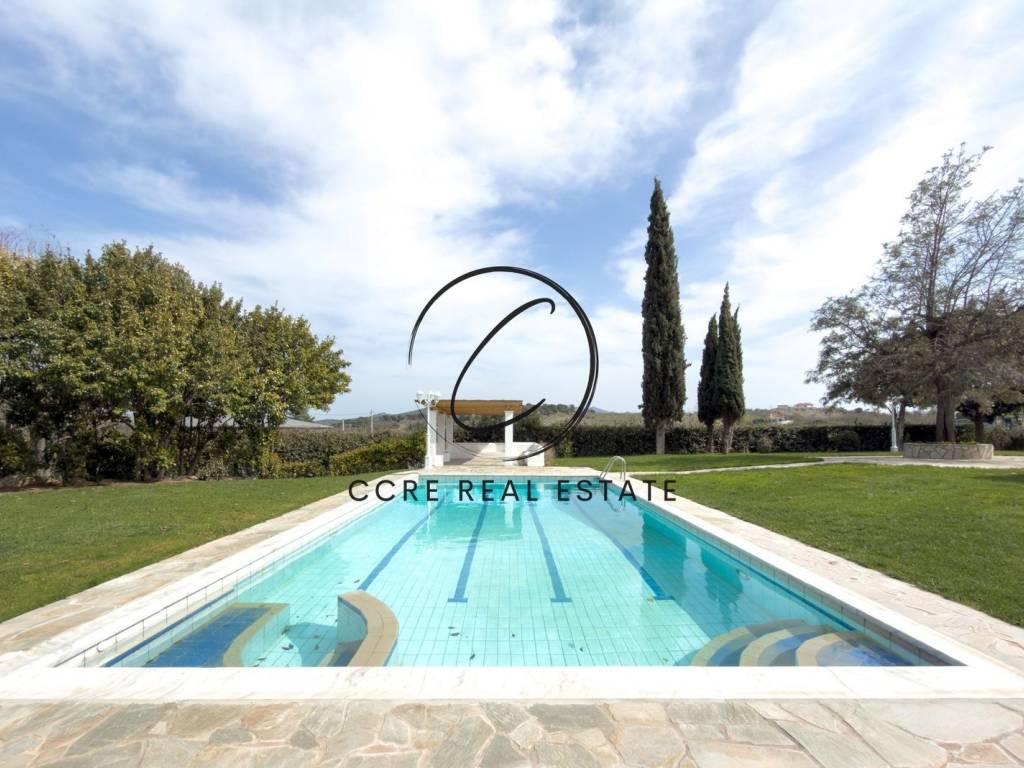 Detached house For sale, floor: Ground floor, 1st, 2nd (3 Levels), in Markopoulo - Mesogaia. In one of the most beautiful and lush areas of Markopoulo Mesoigaia, within a private 4,000 sq.m. estate, we discover an impressive 450 sq.m. villa that harmoniously combines luxury, comfort, and absolute privacy. This is a high-specification residence designed to offer a unique living experience in nature, without lacking any modern amenity. Access to the residence is from the elevated ground floor facade, where visitors enter a stunning, luxurious, and exceptionally bright living room with an open-plan kitchen and guest WC. Large openings allow natural light to flood the space throughout the day and lead to a wonderful outdoor area ideal for garden dining, creating a natural continuity between indoor and outdoor environments.Descending a few steps, we reach the ground level with a fully independent guest house offering comfort and privacy for guests. It features a particularly spacious bedroom, large kitchen, bathroom, and another bedroom, with direct access to the enchanting garden. There, we find the BBQ area and traditional wood oven, perfect for unforgettable hosting moments and family gatherings. Nearby in the same impressive outdoor space are a basketball court, playground, and a wooden playhouse straight out of a child's dream.Ascending the elegant marble staircase to the upper floor, there are three comfortable and bright bedrooms, one of which is en suite. Polished oak floors add timeless elegance to the spaces, while all bedrooms have their own balconies overlooking the greenery. The attic retreat, a 45 sq.m. multifunctional space ideal for an office, relaxation area, or additional guest quarters, is located on the top floor.Overall, the residence offers five spacious bedrooms, three bathrooms and two additional WCs, two fully equipped kitchens, two living rooms with fireplaces that create an atmosphere of warmth and hospitality, and independent heating per level with thermostats for complete comfort and autonomy.The outdoor space is a true highlight of the property. The lush garden with abundant trees and flowers, irrigation system, tasteful pergolas, and impressive 72 sq.m. private pool create the perfect setting for relaxation or high-level summer receptions. Poolside, in a discreet spot, are male and female toilets just like in organized clubs. The property also includes enclosed parking for two cars, while two wells provide significant autonomy for garden maintenance.A key advantage is that the broader area is designated as a Natura zone, ensuring no future intensive development or new construction that could alter the natural environment. Thus, the unique sense of tranquility, privacy, and connection to nature will remain unchanged over time.The villa's prime location makes it even more appealing, just 10 minutes from local beaches, 12 minutes from Athens International Airport, and 10 minutes from Attiki Odos, while being near significant archaeological sites and cultural points of interest.This is a rare residence offering a distinctive lifestyle, combining the privacy of a luxurious estate with direct access to the city and sea. An ideal choice for a primary home or an exceptional high-end vacation property. CCRE GROUP , contact phone: 2130223537, 6945072569, email: info@ccre.gr, website: www.ccre.gr