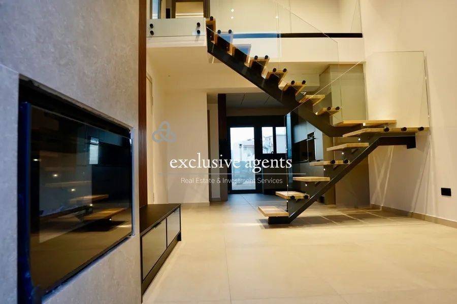ID 2285807. For sale: maisonette 100 sq.m., price €580,000 (€5,800/sq.m.), in Peristeri — Nea Sepolia (121 33), Athens, Western Suburbs. It is a penthouse on two levels (4th & 5th floors), under construction with delivery in 2026, with energy certification A+. Designed and built in a contemporary aesthetic with emphasis on functionality and comfort, located in a quiet neighborhood with good views of the urban landscape. Layout: 3 bedrooms, 2 bathrooms, open-plan living-dining area with double-height ceiling, separate kitchen and 1 lounge. The maisonette is bright, airy and cross-ventilated, corner-facing, with large orientation toward natural light. There are balconies and a private outdoor roof terrace on the upper level where a jacuzzi has been installed for relaxing moments with city views. A storage room is included for additional storage space. Materials and equipment: high-strength tile floors in the common areas, wooden steps on the modern interior staircase with glass balustrades that provide a sense of openness and elegance (as shown in the photos). Exterior glazing is double-pane and the frames are aluminum, ensuring thermal and acoustic insulation. The bedrooms feature built-in closets of high aesthetic quality. The entrance door is armored for security. Heating and air conditioning: autonomous heating with a heat pump, underfloor heating and the ability to control by level. Additionally, air conditioning in all rooms. Energy provisions have been made for economical and efficient operation. Comfort and features: built-in fireplace in the lounge creating a cozy focal point, elevator in the building, insect screens and awnings on the windows, and pets allowed. The residence is painted and will be delivered with high-quality finishes. The layout provides privacy for the bedrooms and open common areas ideal for family living or entertaining. Location & accessibility: excellent proximity to public transport (metro, buses), a park, schools, kindergarten, a square and a church. Within short distance are a farmers’ market, supermarkets, a shopping center, entertainment venues, eateries and the city center, making this an ideal option for everyday living with comfort and convenience. Highlights: impressive two-storey living area with modern interior staircase and glass balustrades, access to a private terrace with jacuzzi and open views, practical storage room, elevator and high energy-efficiency systems. Construction is planned with contemporary systems and high-quality, durable finishes. Exclusive Agents, contact phone: 2102200880, email: info@exclusiveagents.gr, website: www.exclusiveagents.gr