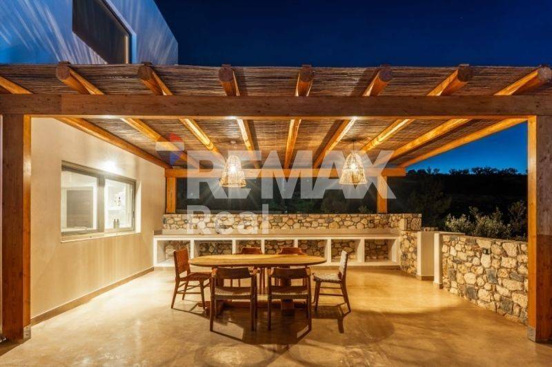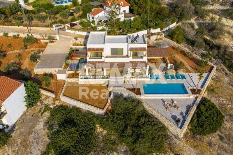 Luxury Villa with Panoramic Sea Views – In One of the Best Locations in Hersonissos Completed in the summer of 2025, this villa is a true masterpiece of contemporary Mediterranean architecture, situated on one of the finest plots in the exclusive Sarandari area of Hersonissos. With a total living space of 250 sq.m. on a generous 2,538 sq.m. plot, it offers breathtaking panoramic views of the sea, the sunrise, and the stunning natural landscape of Northern Crete. The ground floor features an open-plan living area with a modern kitchen, dining space, and a comfortable lounge, flooded with natural light thanks to large sliding doors that seamlessly connect the interior with the outdoor spaces. On the upper level, you’ll find two spacious bedrooms with balconies and a shared bathroom, as well as a luxurious master suite complete with a private bathroom, walk-in closet, and unobstructed sea views. Outdoors, the villa is designed for ultimate comfort and relaxation, boasting a private infinity pool with saltwater, sunbathing areas, a fully equipped outdoor kitchen, a BBQ with dining space, and beautifully landscaped gardens. With an eco-friendly philosophy, the property includes a water collection tank, a rich Mediterranean garden with 60 olive trees and a variety of fruit trees, and solar panels to enhance energy efficiency. High-quality finishes, Daikin air-conditioning units, Bosch appliances, and handcrafted oak details further elevate the villa’s premium character. Located in Sarandari, one of the most sought-after areas in Northern Crete, the villa offers tranquility, privacy, and easy access to some of the most beautiful beaches on the island, while being just minutes away from the vibrant center of Hersonissos. Combining minimal luxury, exclusivity, and spectacular views, this villa is an ideal choice for both a permanent residence and a high-value investment.