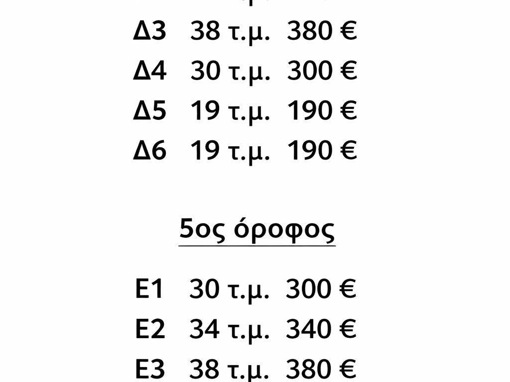 Δ5 19 τ.μ.190 Ε Δ6 19 τ.μ.190 Ε Ε1 30 τ.μ.300 Ε Ε2 34 τ.μ.340 Ε Ε3 38 τ.μ.380 Ε Ε6 19 τ.μ.190 Ε