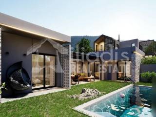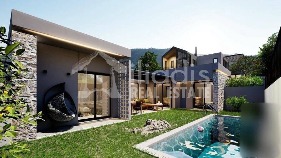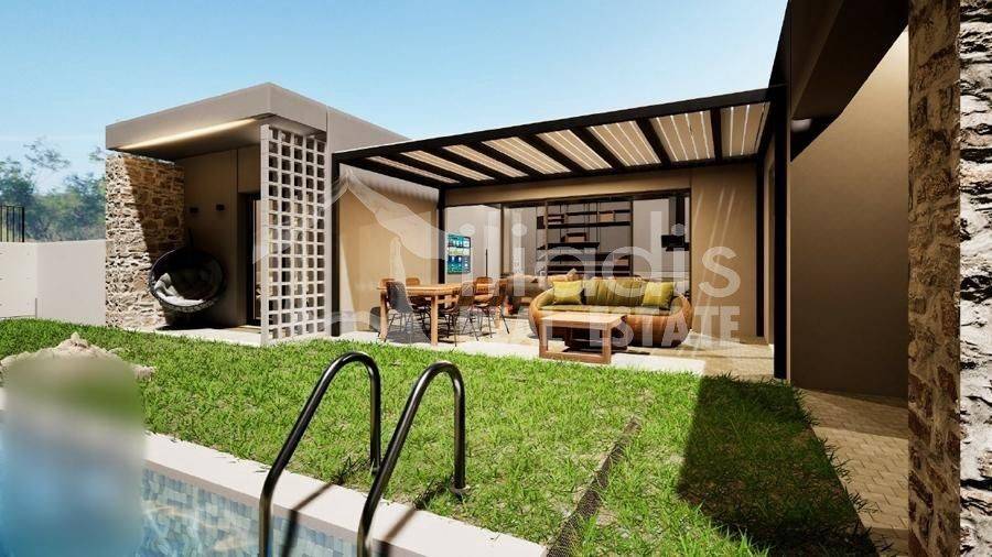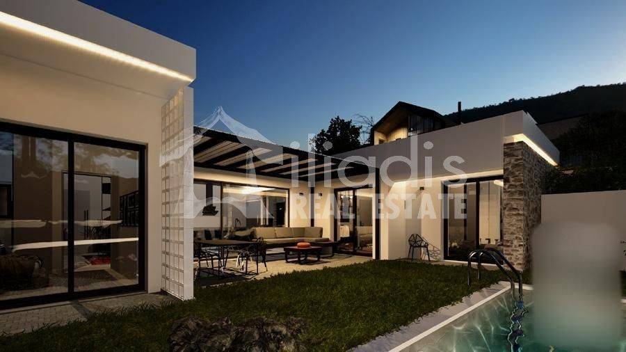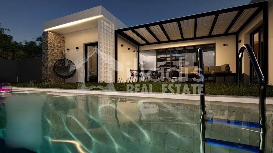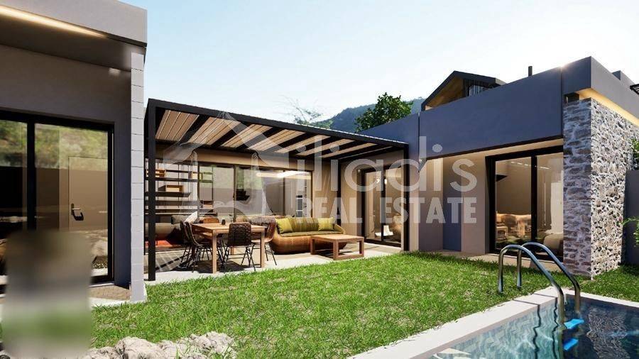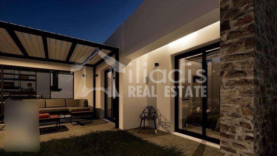 Nea Tiryntha, Agios Adrianos - Detached House 121sqm plot 250sqm, bedrooms 2, master bedroom, levels 1, ground floor, under construction, constructionstage concrete, energy class A+, living room, kitchen, 2 bathrooms, wc, heating type: autonomous (heat pump), a/c type fan coil, parking open space, quiet, dual aspect apartment, luminous, historic monuments view, frontage, painted, electric roller shutters, solar heater, external thermal insulation, balconies, garden, built in appliances, aluminum frames, double glazed windows, door screen, wood floors, without common charges, secure door, alarm, surveillance cameras, video doorbell, luxurious, private pool, within city plan, residential zone, south-western orientation, access from asphalt. A ground floor detached house with a modern aesthetic, with a total area of 121 sq.m. is for sale, within the plan of the settlement of Agios Adrianos in the municipality of Nafplio. This is a point of the settlement where remarkable detached houses with particular construction activity have been created. It is located just 10 minutes from the city of Nafplio and about 15 minutes from the popular beaches of Tolo and Plaka Drepano. It will contain a spacious living room in contact with a dining area and kitchen, a master bedroom with its own bathroom and wardrobe area, two other spacious bedrooms with a shared bathroom and guest wc. From all rooms there will be direct access to a landscaped surrounding area, around the perimeter of the residence. A special point will be part of the outdoor area of 30 sq.m. approximately, in front of the large openings of the living room, dining room and kitchen which will constitute the main terrace for the outdoor living room and will be covered with a modern pergola. In the surrounding area there will be a private swimming pool of 13 sq.m. The residence will be located within a plot of 250 sq.m. delimited by a stone retaining wall, a row of trees and an open parking space. It will have a pleasant view of the city of Nafplio with the Palamidi castle and the picturesque green environment with the hills and houses that surround it. The house will be of exceptional luxury construction, will have energy class A+, insulated with rock wool, will provide individual cooling and heating with an electric heat pump, solar water heater, large openings with energy-efficient aluminum frames with electric shutters, double glazing, screens, wooden parquet floors, built-in wardrobes, security door and alarm system with cameras.