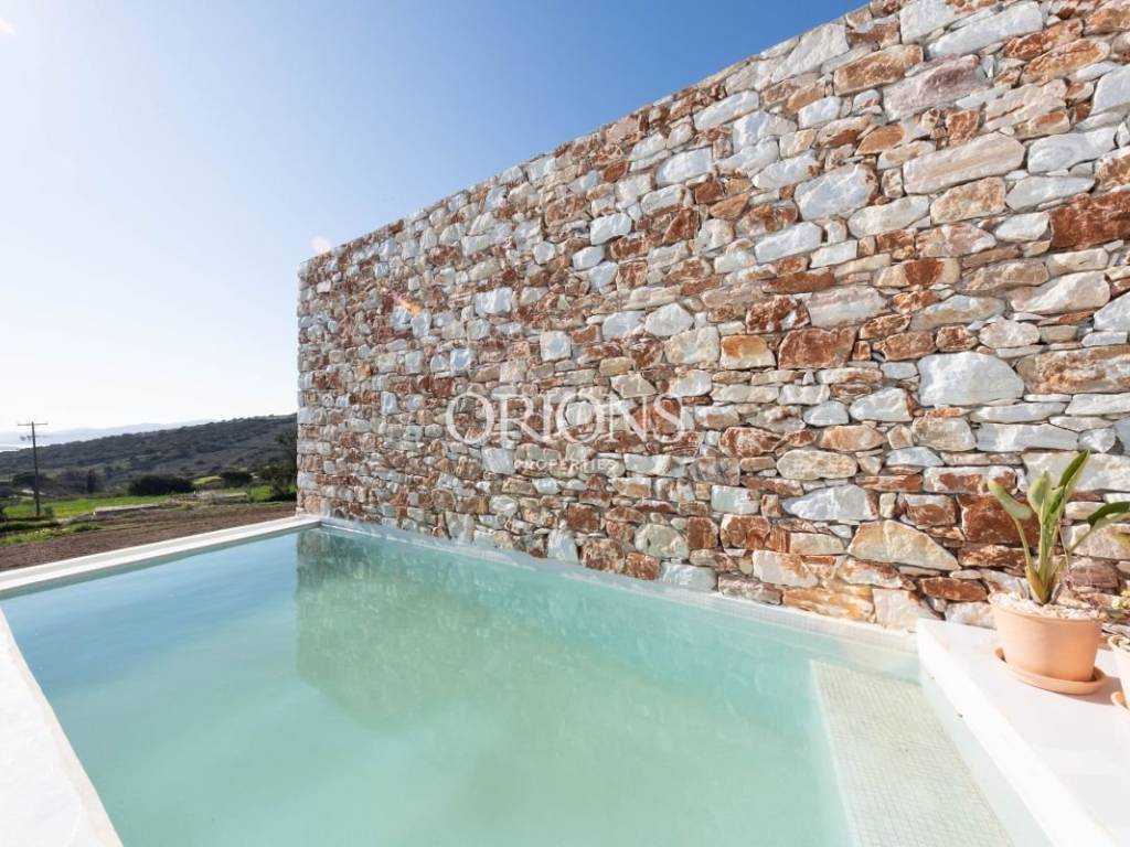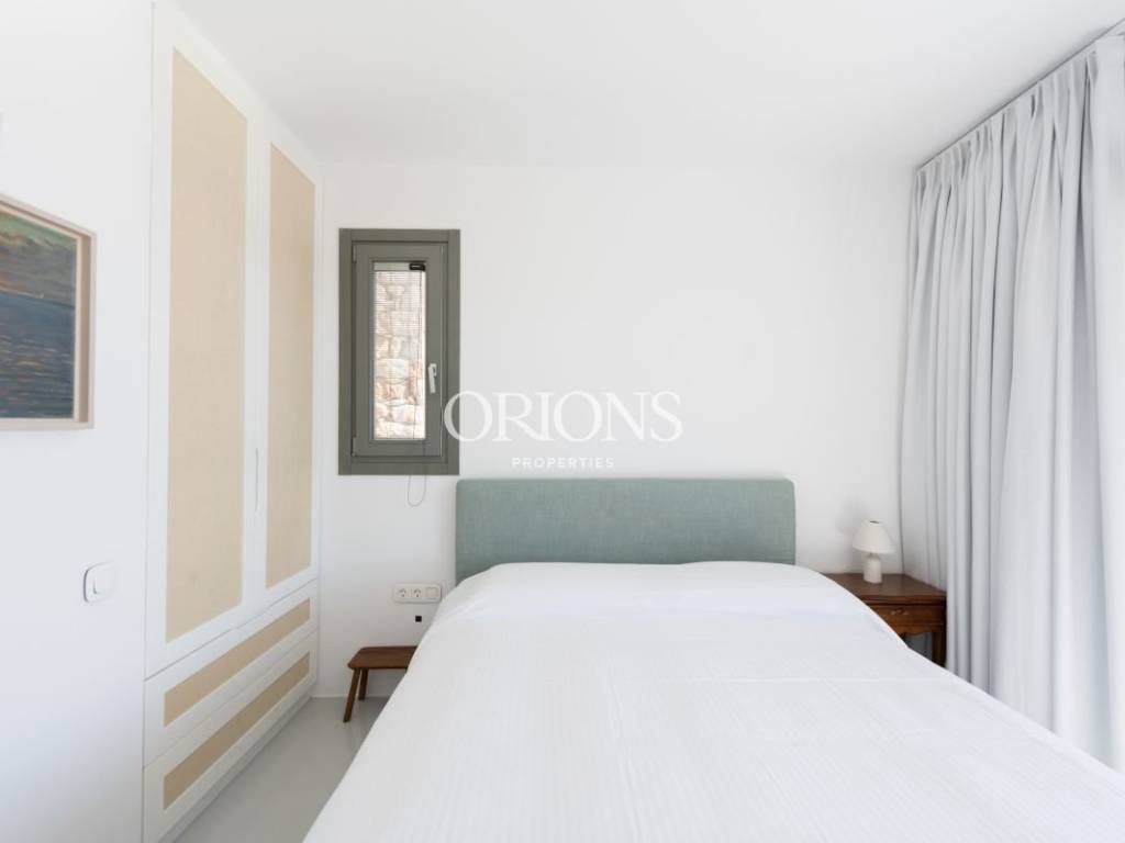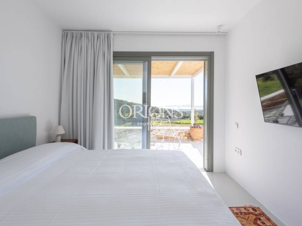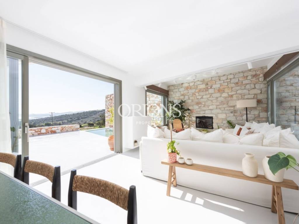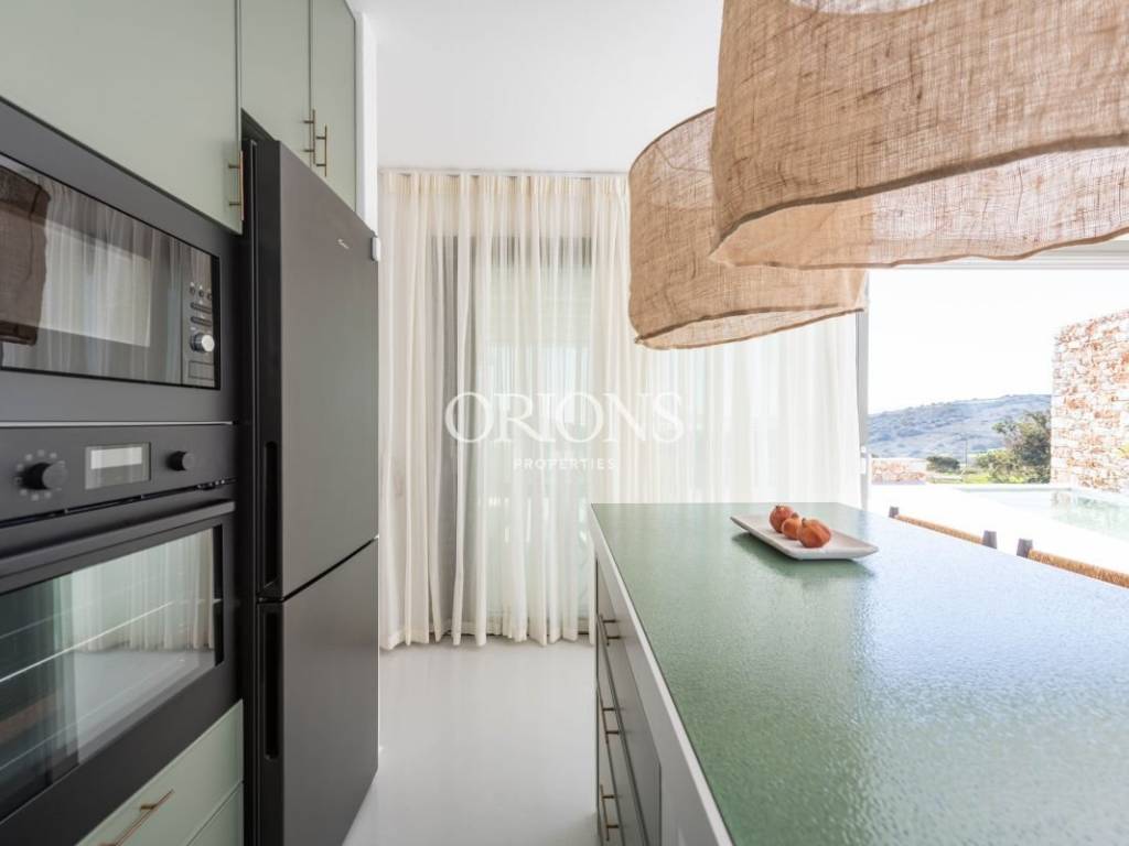 The residence offers stunning, unobstructed views of the Aegean Sea and the surrounding islands, thanks to large openings that fill the interior with natural light and highlight the landscape. The kitchen is fully equipped, designed to meet both everyday needs and entertaining.