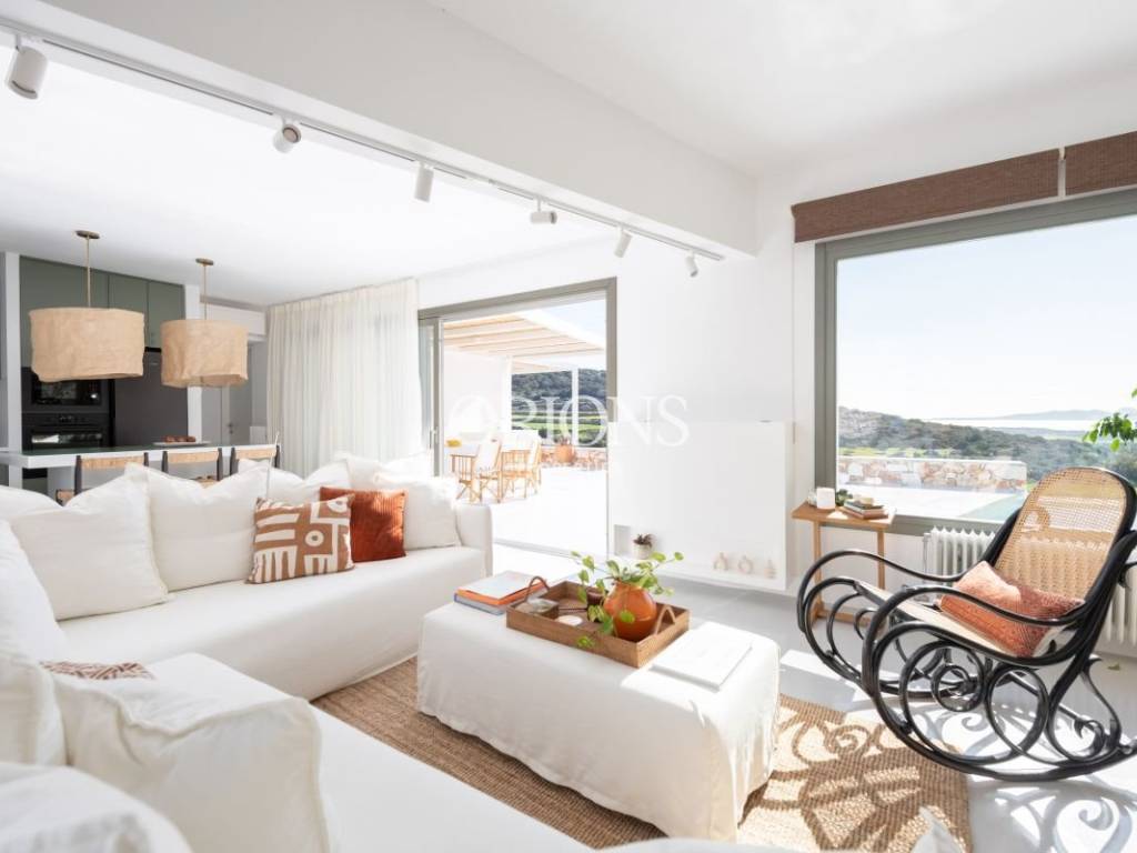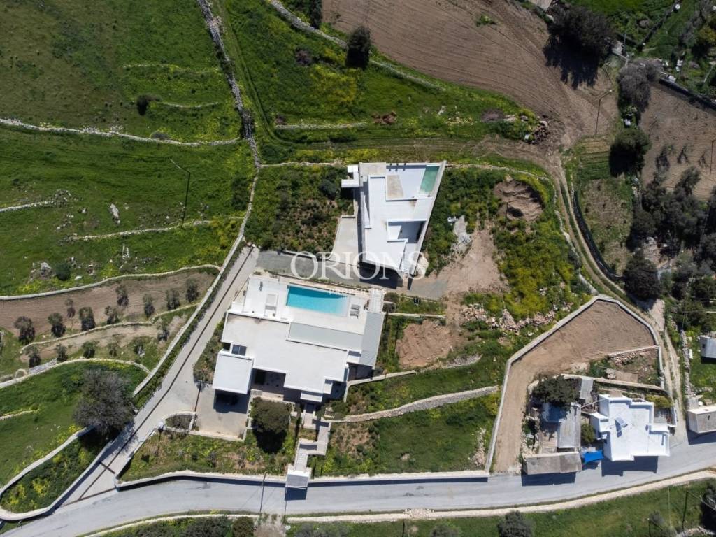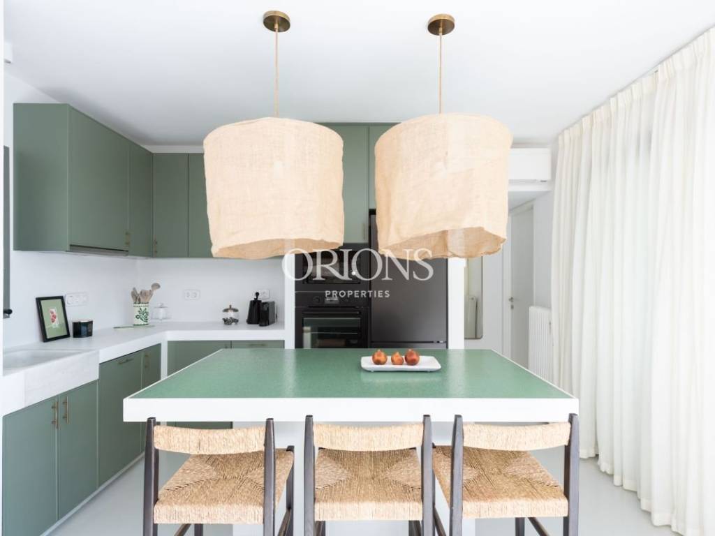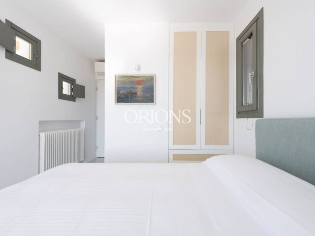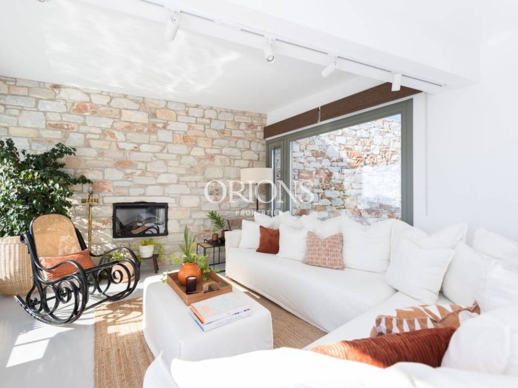 The residence offers stunning, unobstructed views of the Aegean Sea and the surrounding islands, thanks to large openings that fill the interior with natural light and highlight the landscape. The kitchen is fully equipped, designed to meet both everyday needs and entertaining.
