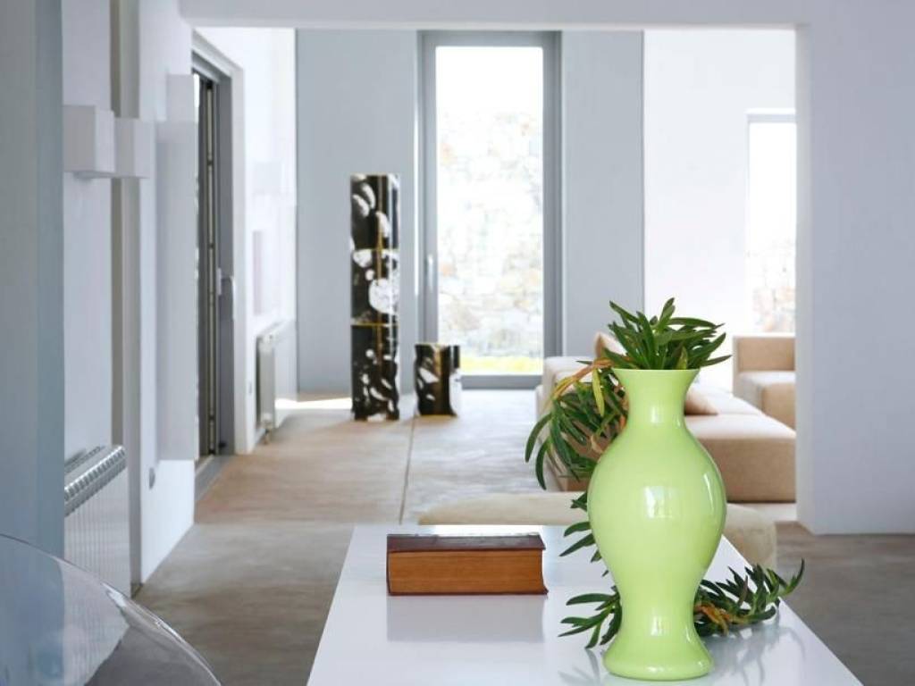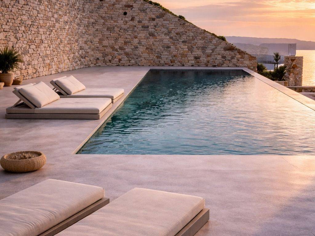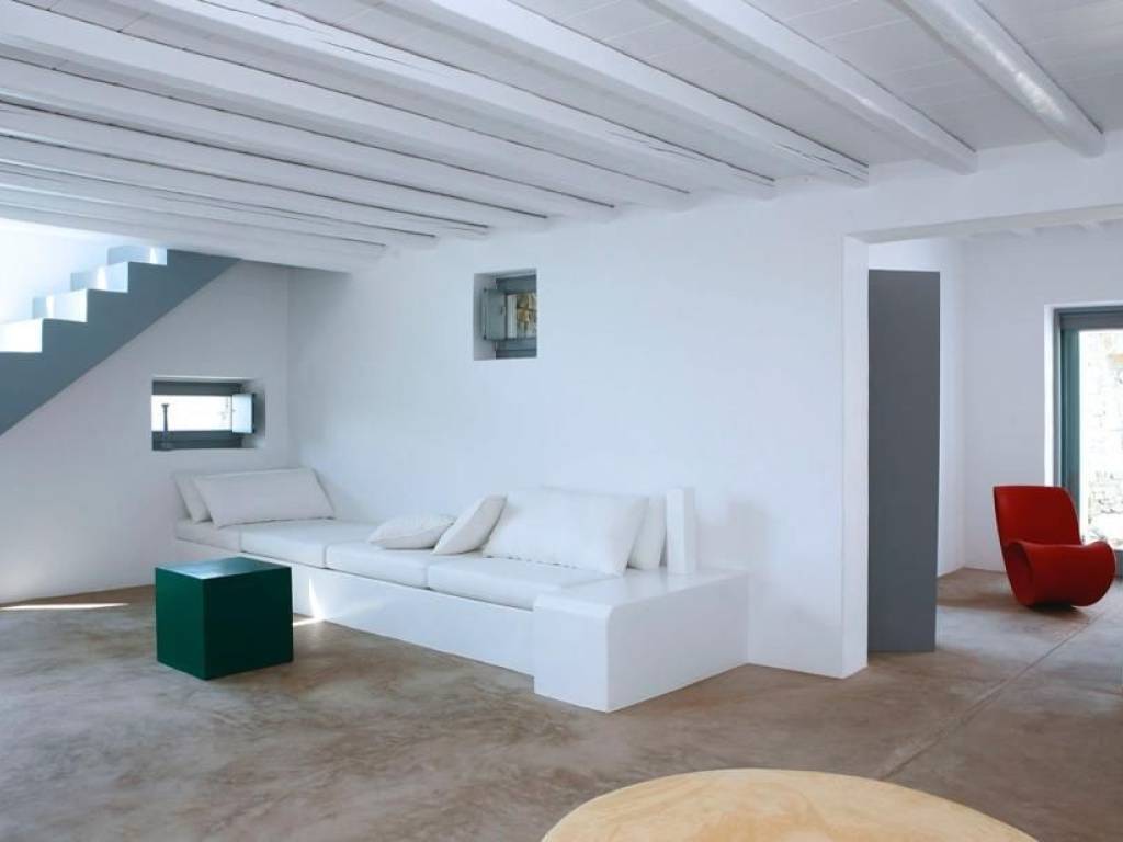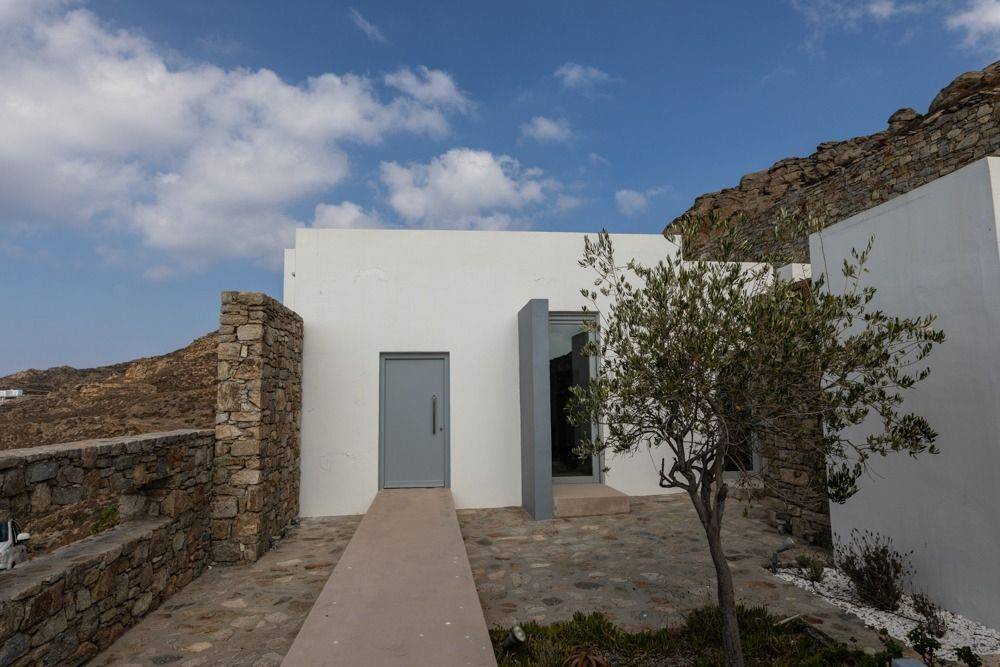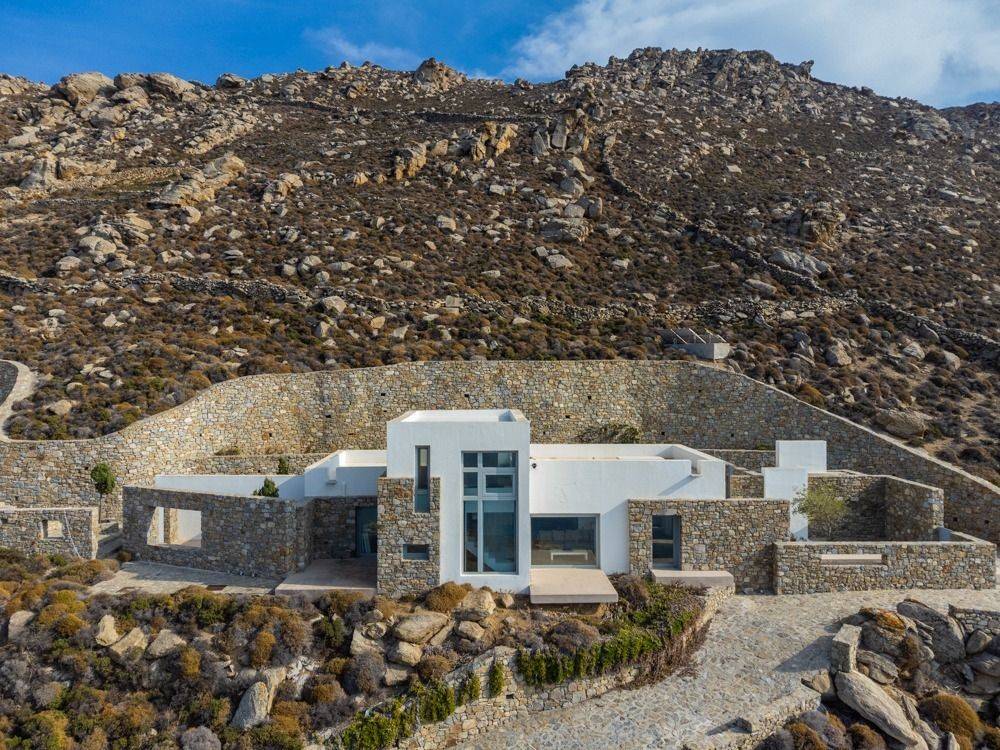 Mykonos, Ftelia – Villa 245 sq.m. on a fully landscaped plot of 7,727 sq.m. Three spacious reception areas, 3 bedrooms, 3 full bathrooms and a dressing area, fully equipped kitchen, 3×10 m swimming pool, helipad, unlimited (unobstructed) view, minimal aesthetic.
