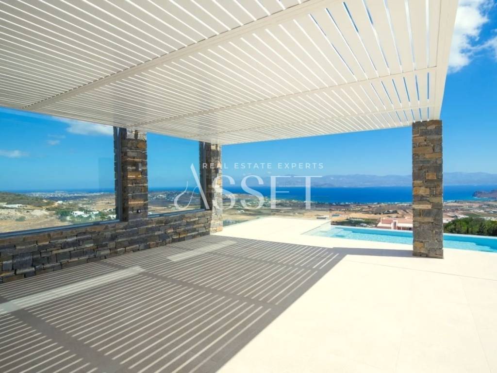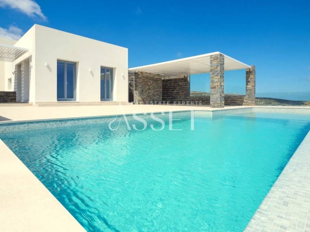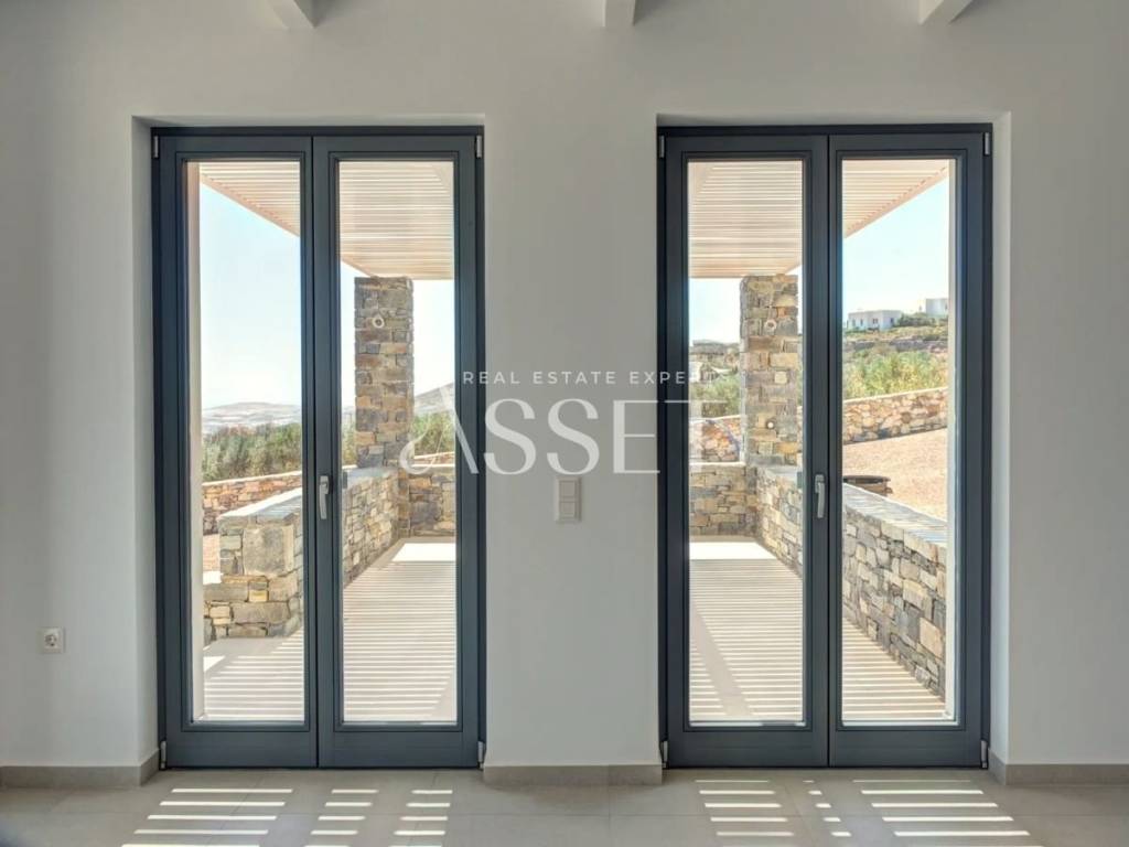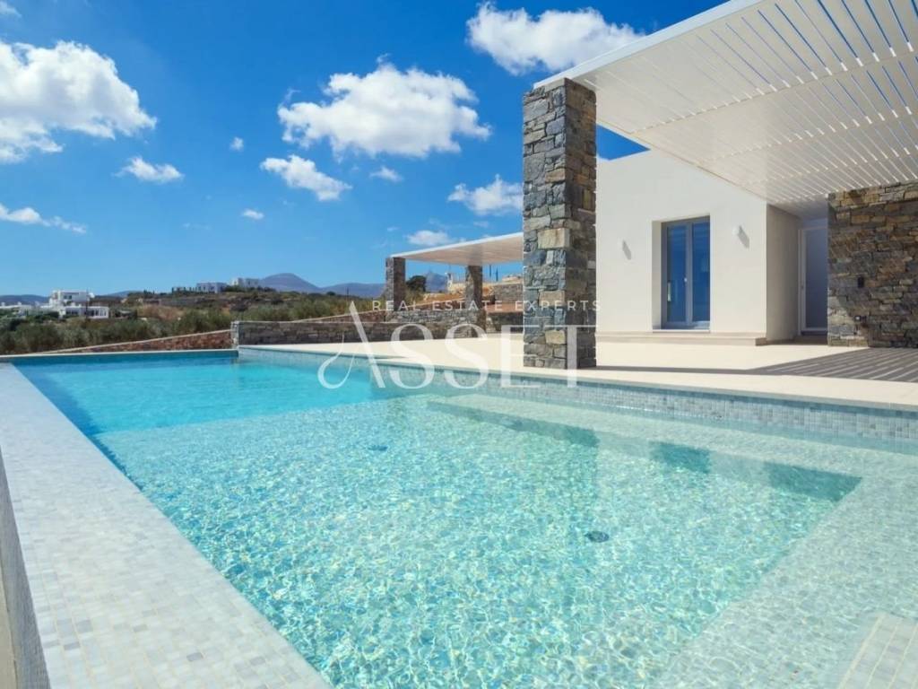 For sale: a luxurious 234 sq.m. villa in Paros, offering panoramic views of Mykonos, Naxos, and Ios. This property is a high-performance passive house (A+), providing significant energy savings for heating and cooling. The villa is developed over two levels: the upper level (138 sq.m.) features a spacious living room with panoramic sea views, a fully equipped kitchen, two bedrooms including a master, and two bathrooms with sea views. The lower level (79 sq.m.) includes two additional bedrooms, one master, two bathrooms, a large terrace with direct access to the pool, and a utility room for the passive house management system. The exterior spaces include a private garden of 1,292 sq.m., terraces of 165 sq.m., a 40 sq.m. pool, a barbecue area, and wind-protected outdoor areas, while the roof is accessible for sunbathing with uninterrupted views of the sea and surrounding islands. This villa represents an exceptional investment opportunity, combining luxurious living, privacy, and a minimal environmental footprint.