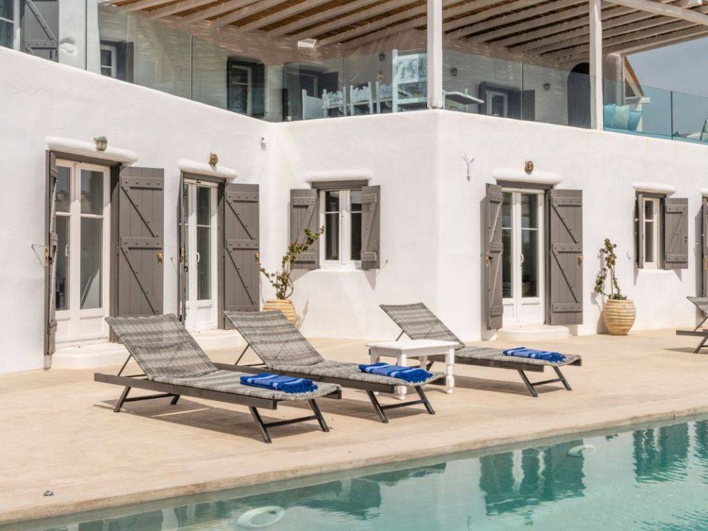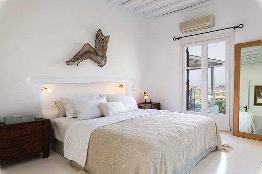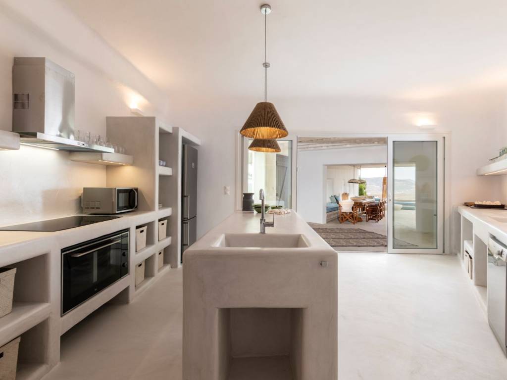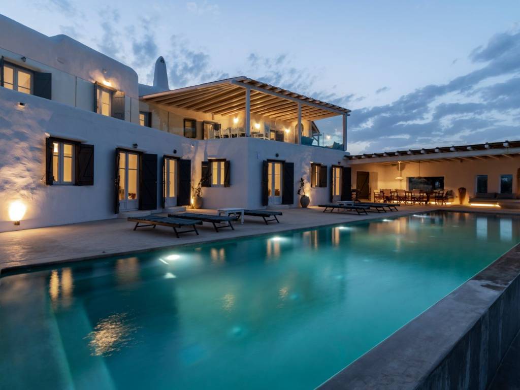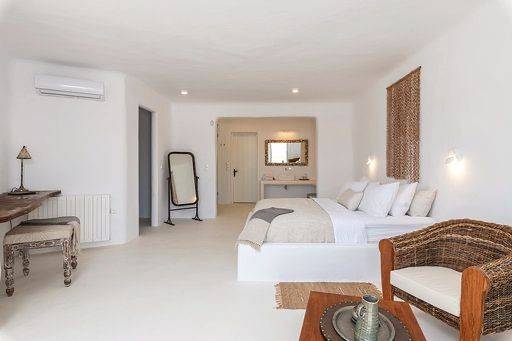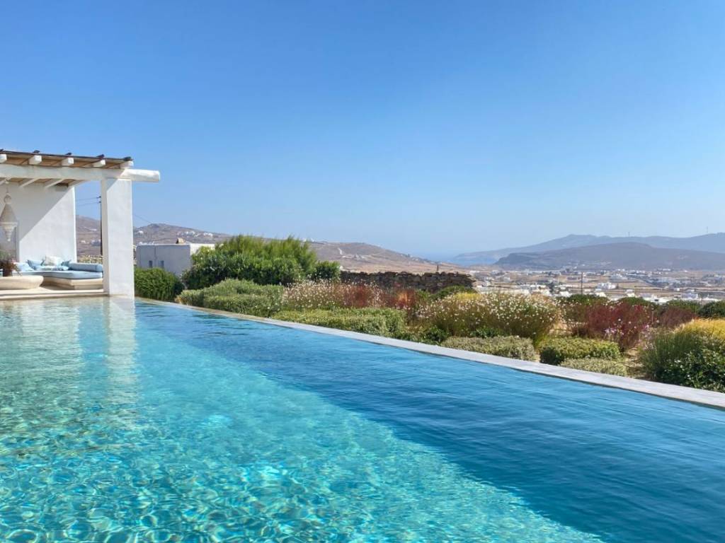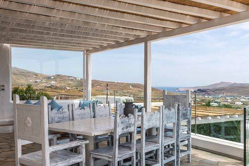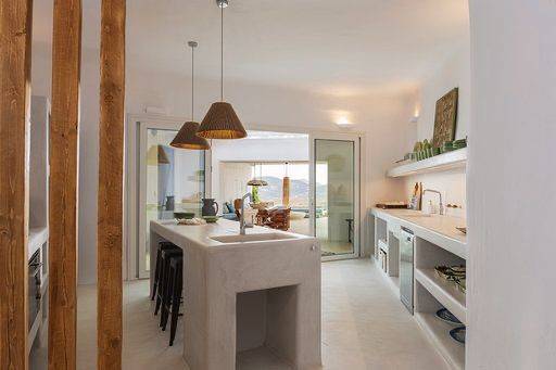 Located just a 5 minutes’ drive away from Mykonos town Villa Aura will offer you way more than you expected. Built-in an unpredictable artistic rustic style, keeping its own character and a different boho and alternative décor. The interior is carefully designed by the owners with a mix of the personal collection of items from all over the world. Some of them are handmade from the owner who likes to create art from scratch using leather and wood as main materials. The whole villa interior design is influenced by hot blood countries such as Mexico and Spain. Villa Aura offers to main entrances. The upper entrance will immediately lead you to the main living area which consists of a living room with cozy couches, a dining area, and a fully equipped kitchen with 2 balcony doors leading at the amazing balcony with incredible sea view. The same level is located in a double bedroom with en suite bathroom and balcony door with a sea view. Next to the main living area is located in the master bedroom with ensuite bathroom with bathtub, shower and skylight, sitting area and balcony doors leading to the outdoors with amazing sea view. A few steps lower you will find the gym room where you can keep your training routine during your holiday in Mykonos. This level is located in the second fully equipped kitchen and four more double bedrooms, all with en suite Villa Aura bathrooms and direct access to the pool level. All the rooms offer independent entrance giving its guest privacy the need. Two of the four bedrooms can be used as a total independent guest room as they have a private entrance and lounge area. The outdoors will amaze you. Begin your day with a morning dip in the infinity pool gazing at the Panormos beach beneath you. Invite friends over for a brunch at the shaded alfresco dining and party under the tunes of the outdoor sound system. The extended outdoor area is perfect for hosting a cocktail party under the sparkling stars.