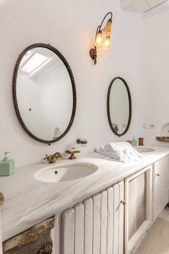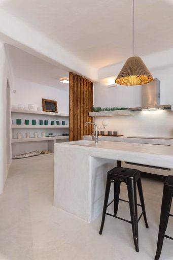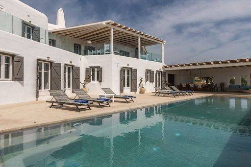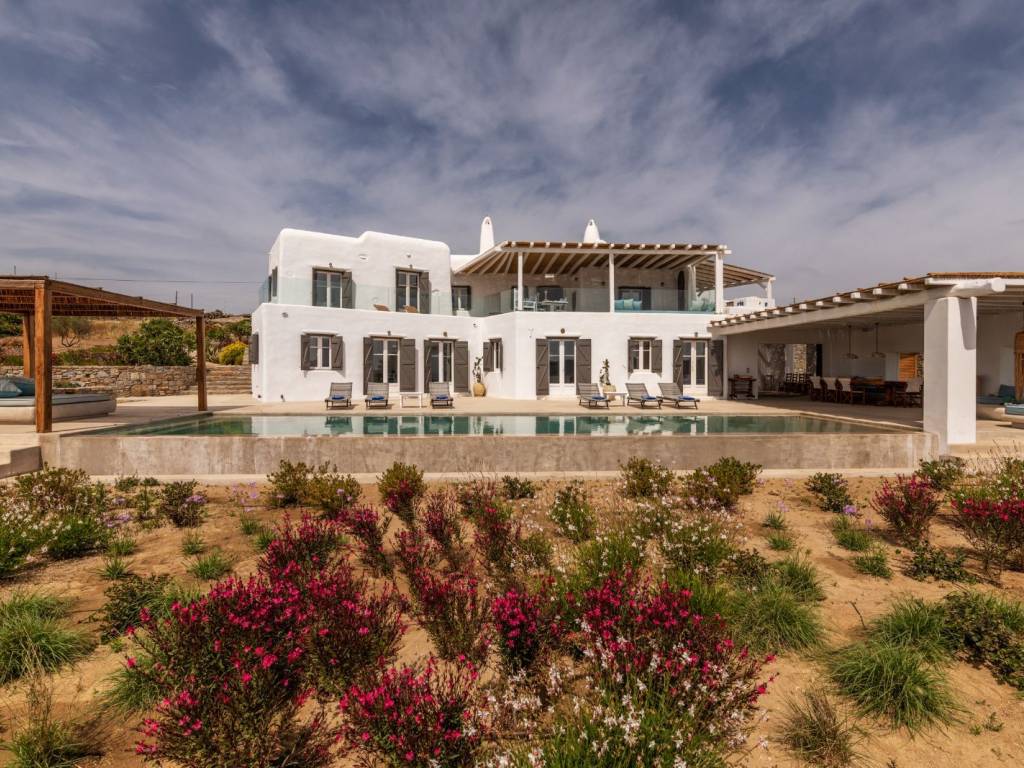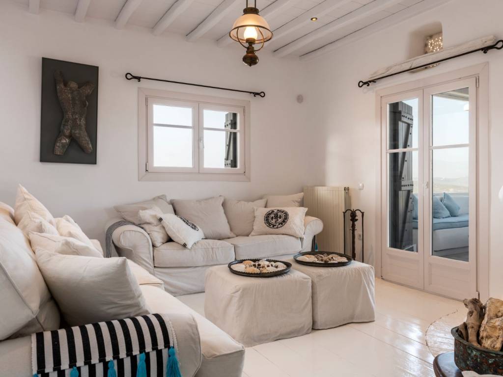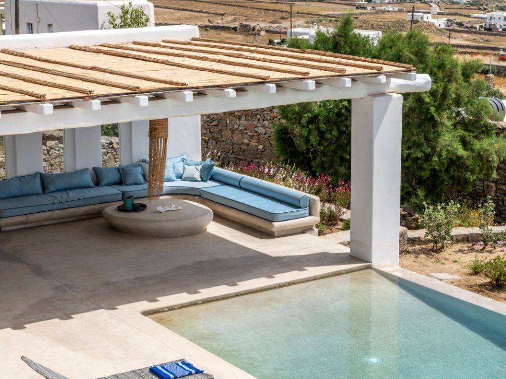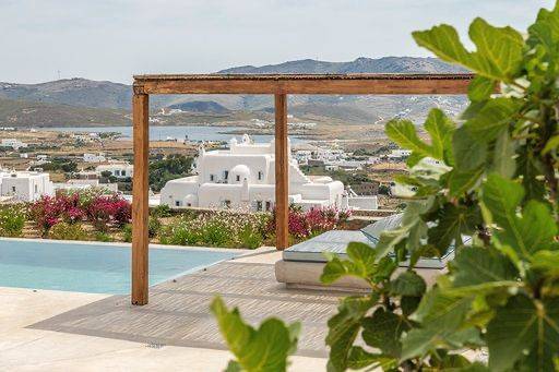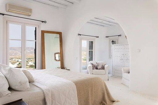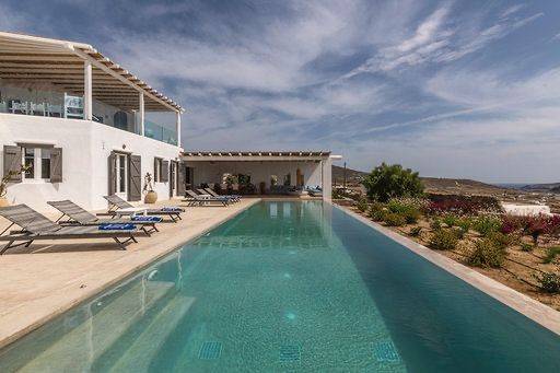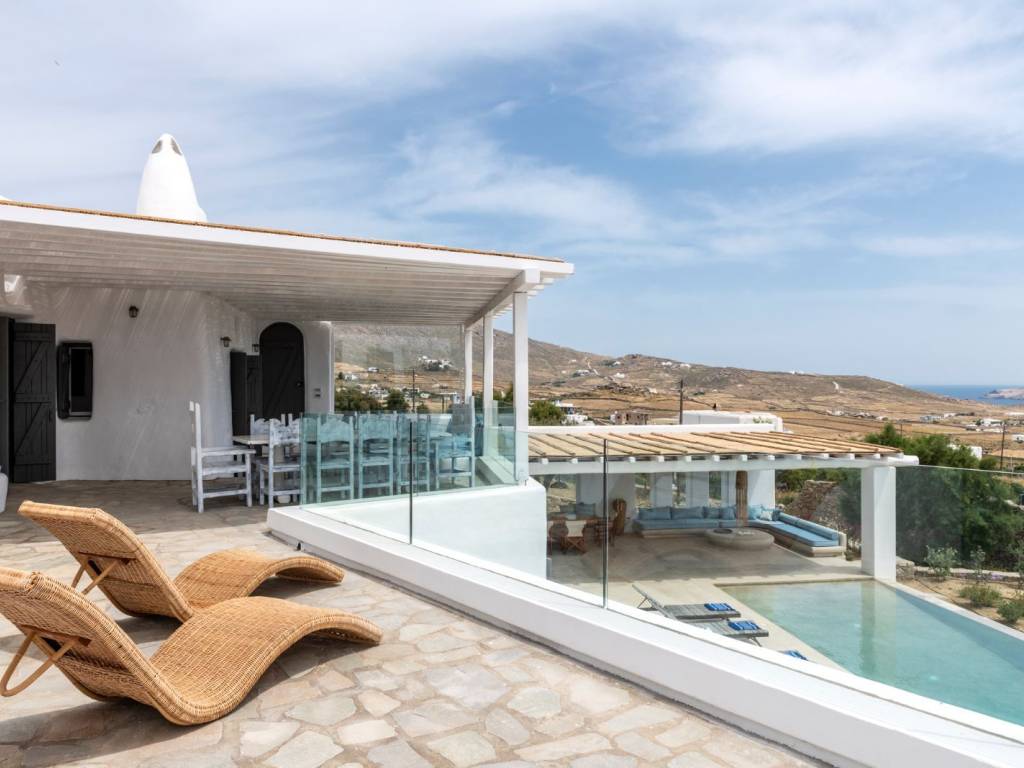 Located just a 5 minutes’ drive away from Mykonos town Villa Aura will offer you way more than you expected. Built-in an unpredictable artistic rustic style, keeping its own character and a different boho and alternative décor. The interior is carefully designed by the owners with a mix of the personal collection of items from all over the world. Some of them are handmade from the owner who likes to create art from scratch using leather and wood as main materials. The whole villa interior design is influenced by hot blood countries such as Mexico and Spain. Villa Aura offers to main entrances. The upper entrance will immediately lead you to the main living area which consists of a living room with cozy couches, a dining area, and a fully equipped kitchen with 2 balcony doors leading at the amazing balcony with incredible sea view. The same level is located in a double bedroom with en suite bathroom and balcony door with a sea view. Next to the main living area is located in the master bedroom with ensuite bathroom with bathtub, shower and skylight, sitting area and balcony doors leading to the outdoors with amazing sea view. A few steps lower you will find the gym room where you can keep your training routine during your holiday in Mykonos. This level is located in the second fully equipped kitchen and four more double bedrooms, all with en suite Villa Aura bathrooms and direct access to the pool level. All the rooms offer independent entrance giving its guest privacy the need. Two of the four bedrooms can be used as a total independent guest room as they have a private entrance and lounge area. The outdoors will amaze you. Begin your day with a morning dip in the infinity pool gazing at the Panormos beach beneath you. Invite friends over for a brunch at the shaded alfresco dining and party under the tunes of the outdoor sound system. The extended outdoor area is perfect for hosting a cocktail party under the sparkling stars.