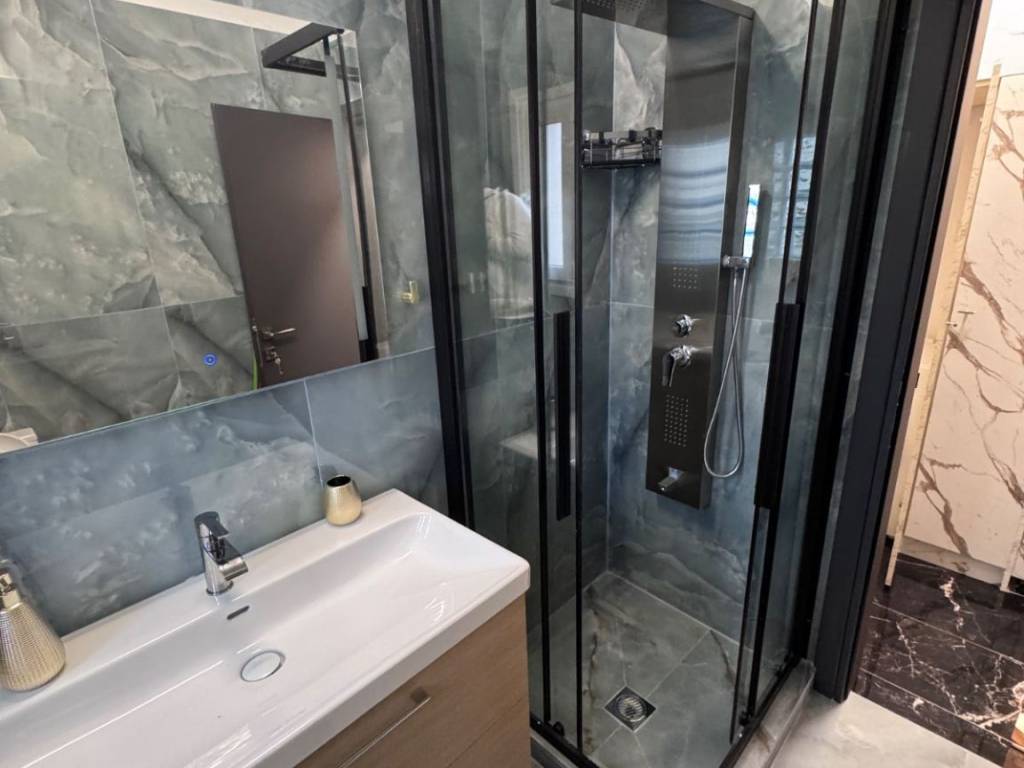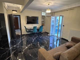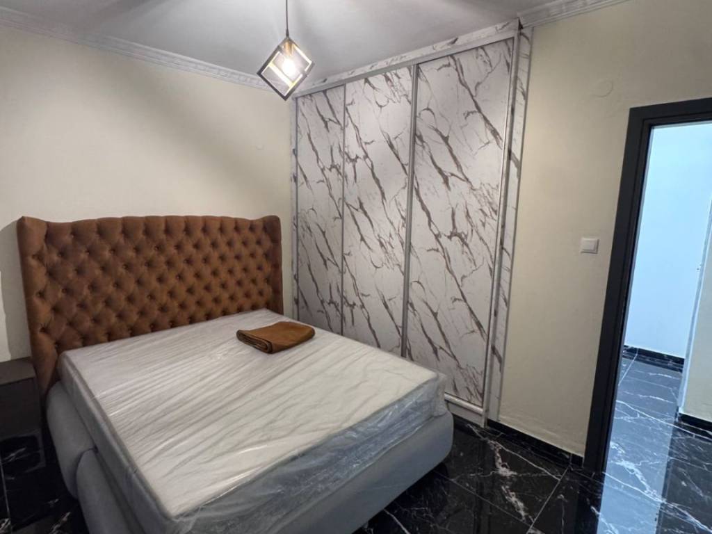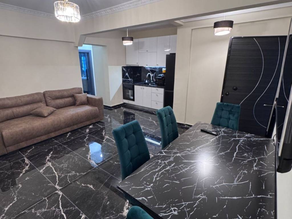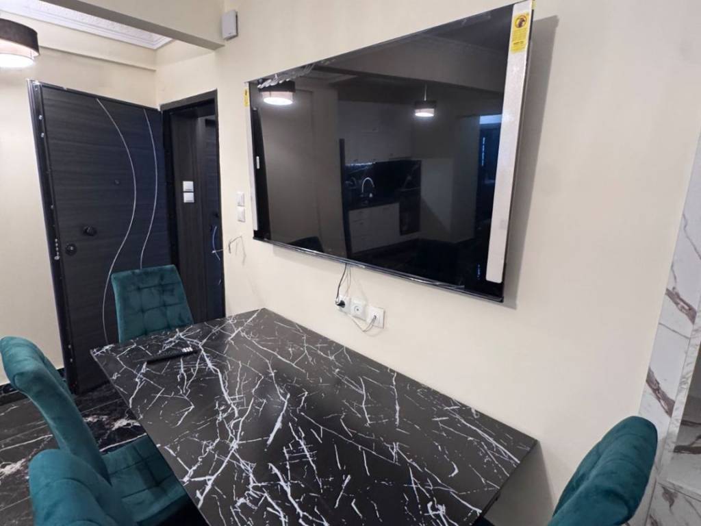 Two-room apartment for rent in the center of Larissa, Agios Konstantinos area, fully furnished, luxurious, fully renovated, with autonomous natural gas heating and 2 air conditioners, with King size luxury bed, armored, new frames, with smart wifi thermostat, three-seater sofa bed, 65 inch smart TV, new white super gloss kitchen, microwave, toaster, coffee maker, cutlery, dishes, glasses, black fridge-freezer, washing machine, Led mirror, shower with hydromassage, shower cabin, dining room with chairs, lighting, iron, black glossy luxury tiles throughout the apartment. parking available for an extra charge