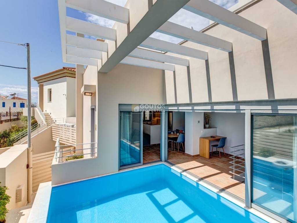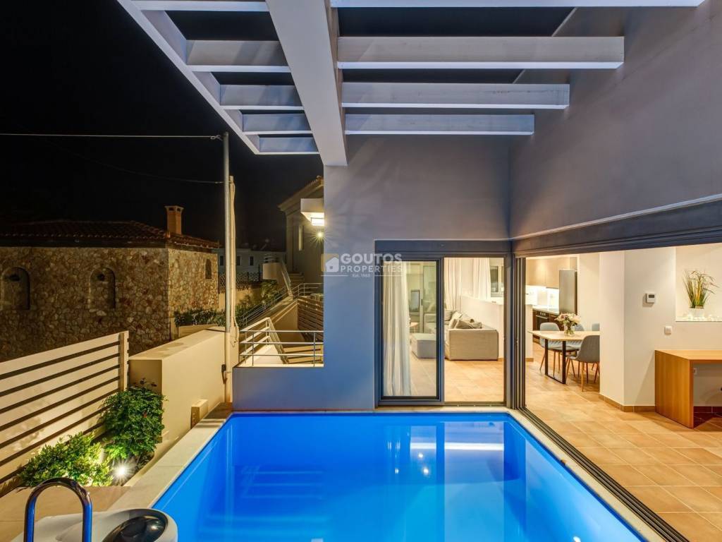 Modern maisonette of 105sq.m. on two levels, with 3 bedrooms and 2 bathrooms, in Porto Heli about 50m. away from the sea, in a unique architecturally designed newly-built complex, with its own entrance and its own pool. It consists of a ground floor where there is a spacious and sunny living room together with the dining room and a fully equipped kitchen. This unified space has a comfortable corner sofa, TV and fireplace, while the balcony door provides access to an idyllic terrace, with a wooden table and chairs, to enjoy the view of the unique Porto Heli. The corner windows offer a direct connection with the outside space, thanks to the proximity to the swimming pool, in such a way that the wonderful blue-green shades of the water diffuse into the interior and are visible from every point of the ground floor, offering the much-desired relaxation and contact with the liquid element . A corridor leads to the two bedrooms, each of which has a double bed, TV, wardrobe and terrace with table and chairs. At the end of the corridor there is a stylish bathroom with a shower. In addition, a staircase starting from the living room, connects the ground floor with the basement. There, you will find another bedroom, with a bunk bed, a sofa, TV and wardrobe, as well as a bathroom with a shower. The house stands out for its modern design and high aesthetics, where the idea of ​​beauty found in simplicity and affordable luxury prevails, offering a pleasant and calm environment both in the interior and the exterior of the house. Goutos Properties, Tel: +302109715711, email: sales@goutos.gr