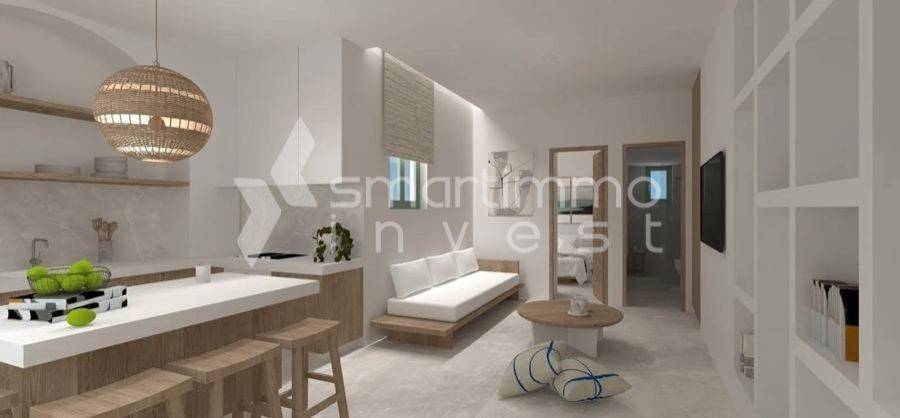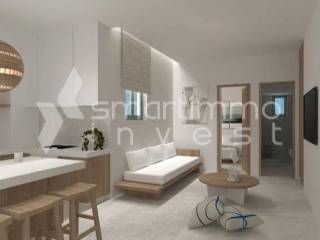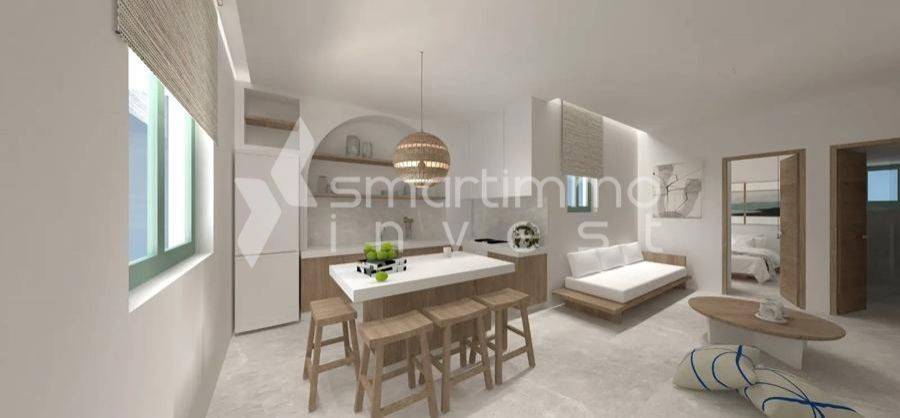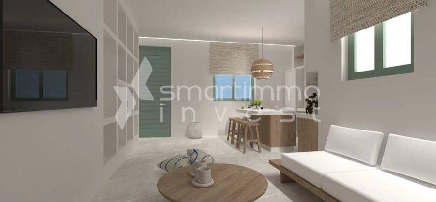 Andros, Hora - Apartment 50sqm plot 70sqm, fully furnished, bedroom, levels 1, renovated, year built 1990, renovation year 2026, energy class A, living room, kitchen, bathroom, air condition, quiet, luminous, painted, luxurious, residential zone, investment property.