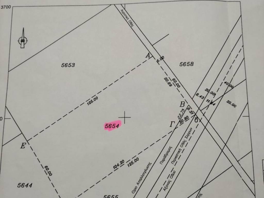 ΣΕΡΡΕΣ, ΠΩΛΕΙΤΑΙ κατά αποκλειστικότητα Αγροτεμάχιο 7403,14 τ.μ. που φαίνεται στο σχέδιο με τα στοιχεία ( Α-Β-Γ-Δ-Ε-Α ) αριθμό 5654. Το Αγροτεμάχιο είναι άρτιο και οικοδομήσιμο.