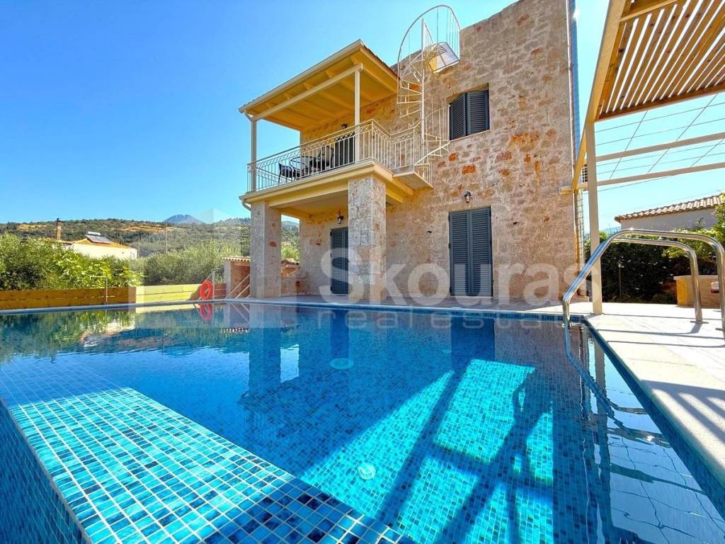 In a highly privileged location, very close to the traditional and cosmopolitan village of Stoupa, and specifically in the settlement of Riglia in Messinian Mani, a 100 sq.m. stone-built detached house is available for sale. This home offers unique aesthetics and high-quality construction. Built on a 400 sq.m. plot, it provides privacy, tranquility, and direct access to the region's natural beauty. The property is entirely stone-built, harmoniously combining local traditional architecture with modern comforts and functionality. The residence is bright and airy, just a few minutes from the stunning beaches of the area. The elevated ground floor features two comfortable bedrooms with direct access to the outdoor area, where a beautiful infinity pool with a salt system takes center stage. The main bathroom is also located on this level, serving both the bedrooms and the outdoor spaces. The surrounding garden is beautifully landscaped with lawn and tasteful planting, and there is a covered BBQ area—perfect for relaxing moments with family and friends. On the upper floor, you’ll find the main living area and kitchen in an open-plan layout, a guest WC, and a storage space. From the upstairs veranda, one can enjoy unobstructed views of the sea of the Messinian Gulf and the imposing Taygetos mountain, creating a stunning scene that changes beautifully throughout the day. The property is delivered fully furnished and equipped, ready for immediate occupancy. It is ideal both as a holiday home or a permanent residence and also presents an excellent investment opportunity due to the growing demand in the area. Messinian Mani uniquely combines natural beauty with authentic character. It is a land of stone-built villages, peaceful beaches with crystal-clear waters, hiking trails, and warm hospitality. Its proximity to Kalamata and the airport ensures easy access, while modern infrastructure supports comfortable year-round living. It is a destination that offers high quality of life, rich cultural heritage, and rare natural landscapes. Skouras Real Estate #1 Greek Real Estate Agency in the Peloponnese 4 Offices: Nafplio | Kalamata | Corinth | Porto Heli 3000+ Properties | 18+ Years of Experience | Support in 5 Languages Marketing & Website – European Property Awards 2020 Marketing Techniques & Development – EPPA 2022 & 2024 Call Center: +30 27211-0135 Mobile: +30 6985795500 Email: dc@skourasrealestate.gr Property Manager: Dimitris Charalampopoulos Over 3,000 properties available at: www.skourasrealestate.gr Note: The property information is based on data provided by the owners. Skouras Real Estate bears no responsibility for any inaccuracies. ID card or passport required for property visits. Map locations are approximate.​