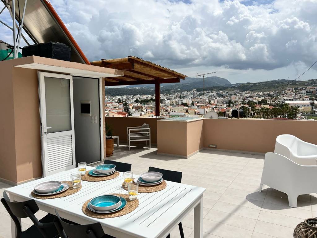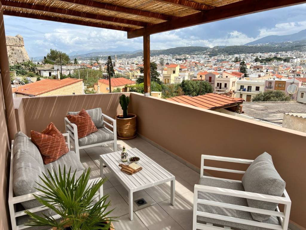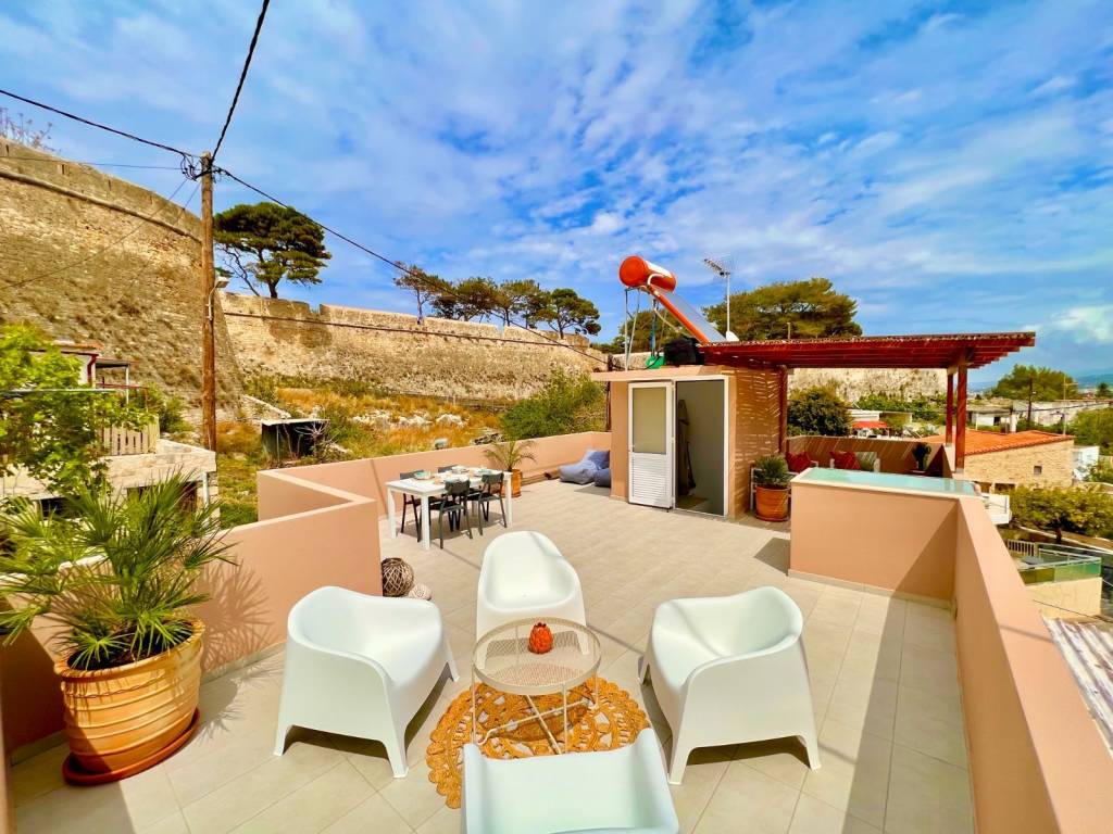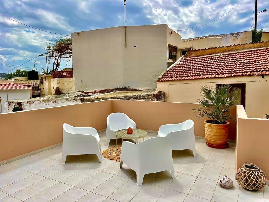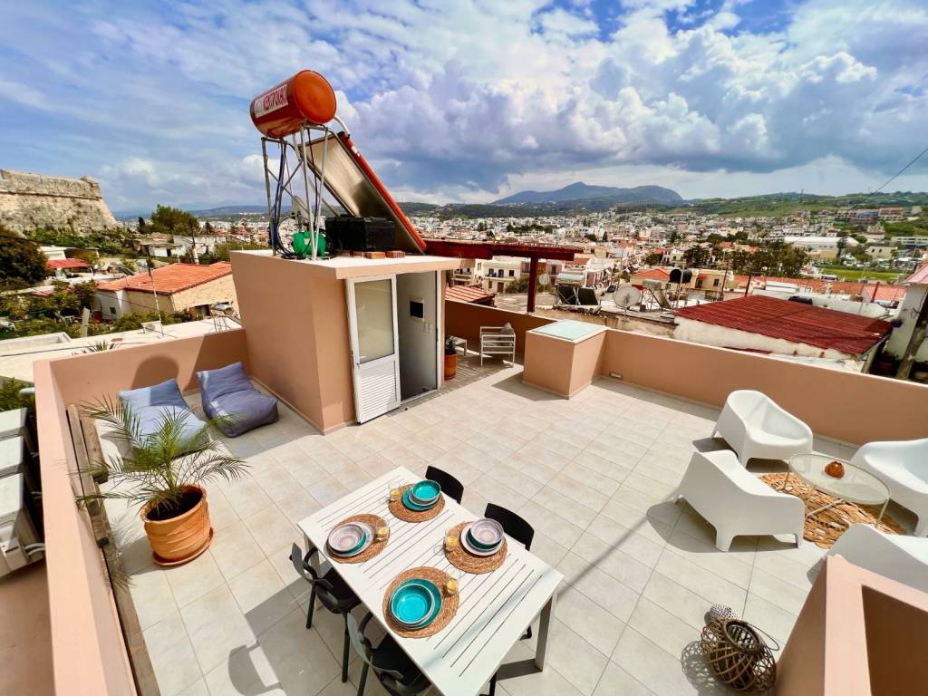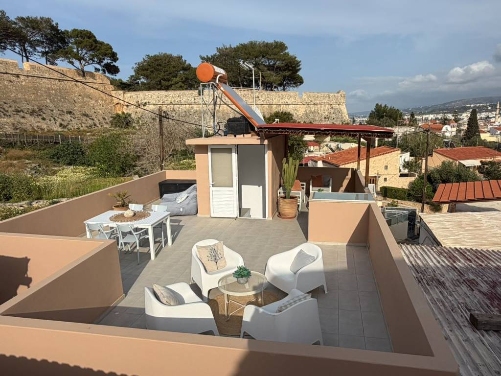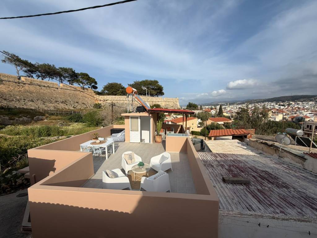 House for sale in Old Town, Rethymno, Crete 2 bedroom house by the Fortezza with amazing view from the rooftop terrace Appr. 135 sq.m. usable space – 2 bedroom house – 2 terraces – Quiet corner of the old town Indoor groundfloor size of the house is 63 square meters. The property has not yet undergone energy certification. It will supposedly be better than what who is stated. -Great view of the old town, mountains and sea -Big 60+ sq. meters rooftop terrace for sun and evening dinners -Shaded coffee terrace on the ground floor -2 minutes walk away for a swim in the sea -Next to the historical Fortezza -Lovely, quiet and native neighborhood -In the heart of old town, Rethymno -2 minutes walk to tavern’s, restaurant’s, supermarket and such amenities -Perfect home for living, vacation or investment opportunity for long or short term rental (Airbnb, Booking, and such) -3 Aircondition/Heater units, In the living room and one in each bedroom -Solar/Electric powered water heater -Extra watertank with pressure pump on the roof (just in case communal water pressure is low) -Fully furnished, and equipped with all necessities – washing machine, combined refrigerator/freezer etc. ready to use! The property has access from a narrow non-traffic road, made for walking. The terrace on the ground floor is tiled and gated. From the terrace you can go in to the house or take the stairway to the rooftop terrace. Ground floor: Livingroom with an open plan kitchen and air-conditioning/heating. Hallway with storage-closet. Bathroom, bright with overhead light and window, shower zone, toilet, washbasin and a washing machine. Master bedroom with closet and air-conditioning/heating. Bedroom with closet and air-conditioning/heating. Staircase to the rooftop terrace. Rooftop: Staircase with storagespace for pillows etc.. Terrace, sunny with amazing view, part of the terrace has a pergola for shade. Please contact me in English, unfortunately I do not speak greek very well. For more information please visit the property website: http://****.**