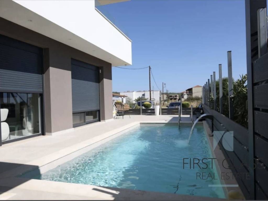 Luxury Maisonette for Sale – Moudania (120 sq.m.) A newly built, fully furnished luxury maisonette of 120 sq.m. is available for sale, set on a 200 sq.m. plot, in a prime location in Moudania, close to the sea. Built in 2024, this exceptional property offers high-end living, combining modern architecture, top-tier energy efficiency (A++), and advanced smart home features. Property Features: 3 master bedrooms 3 bathrooms + 4 WC 1 modern kitchen 1 spacious living room Internal staircase Storage room 1 outdoor parking space Outdoor Areas & Amenities: Private swimming pool Landscaped garden with automatic irrigation Awnings Technical & Additional Features: Autonomous heating Underfloor heating Air conditioning Solar water heater Sound & thermal insulation Aluminum frames with double-glazed windows Tile & marble flooring Smart home system Electric shutters Security Features: Security door Alarm system CCTV cameras A unique high-spec property, ideal for a luxury holiday home or a premium investment opportunity. Contact Information: First Class Real Estate +30 6980803109 gioger1@gmail.com