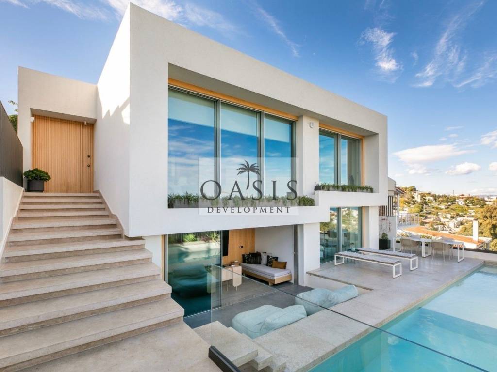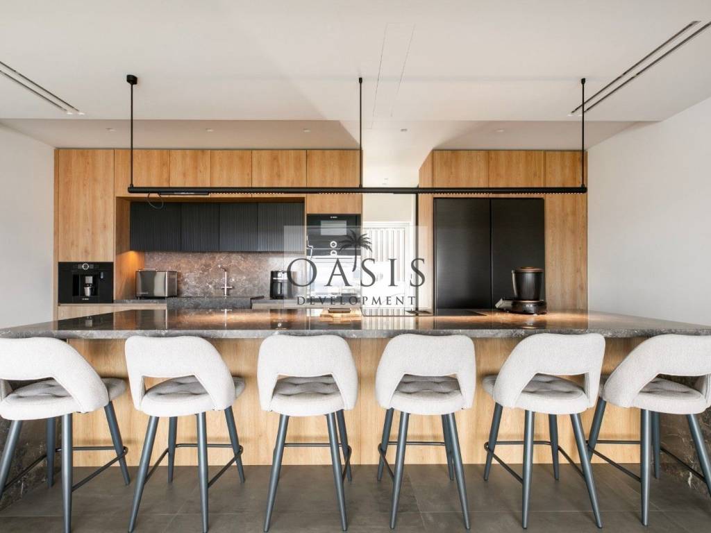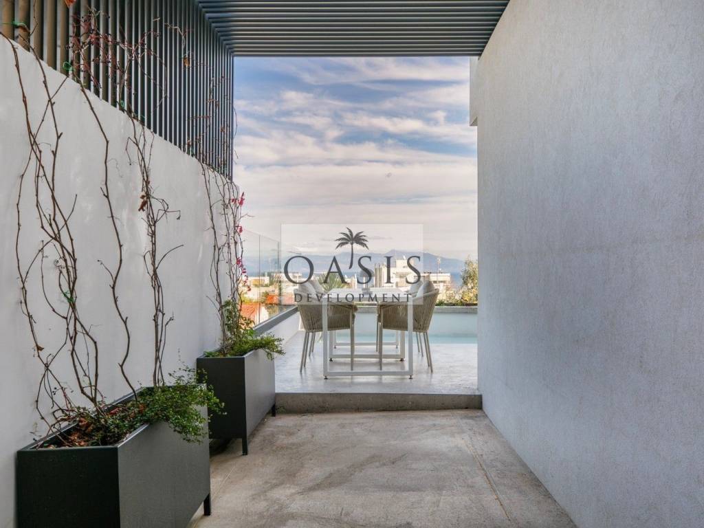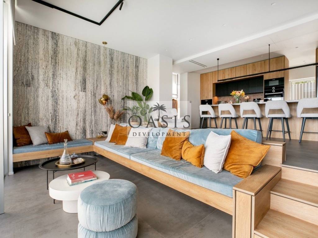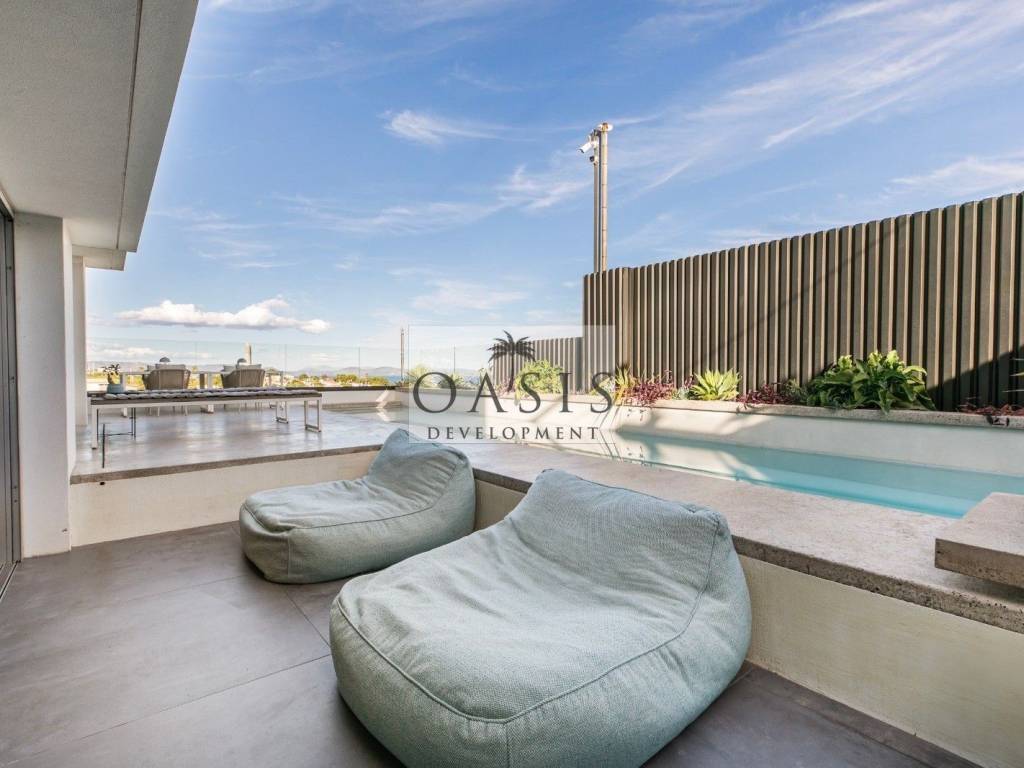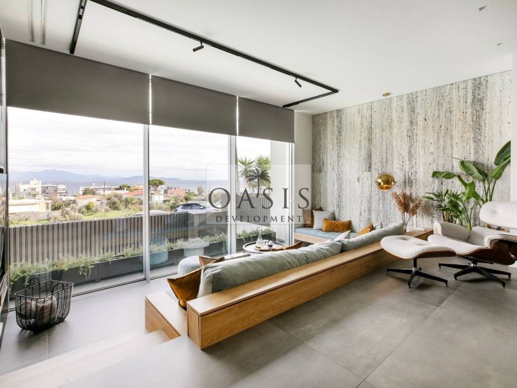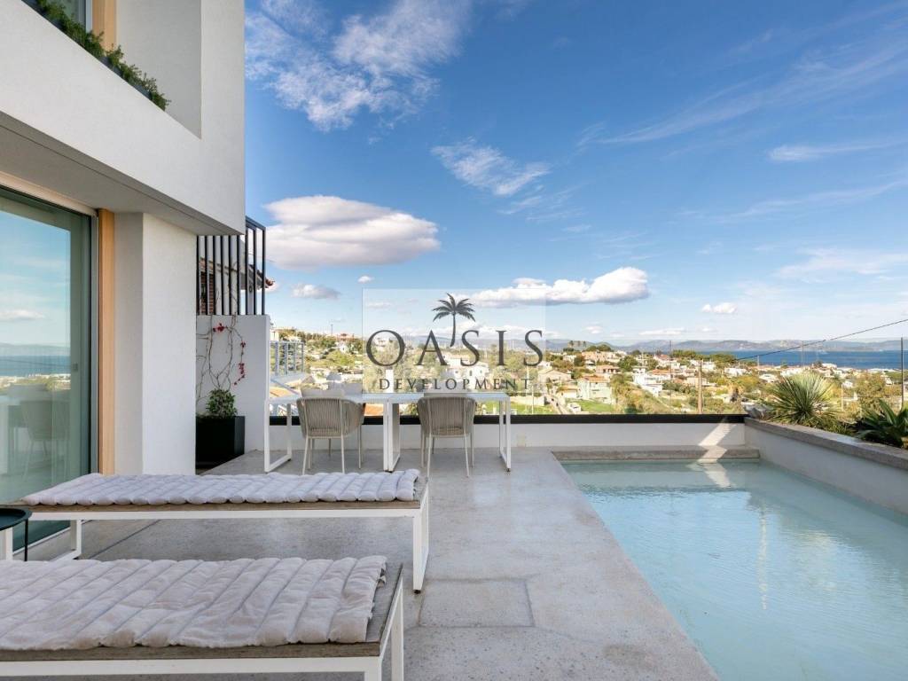 A ridge above Rafina, and on it a single horizontal line: 190 square metres of glass, stone, and concrete arranged to hold the Aegean in view from almost every room. The house is built around restraint. Sliding panels retract into the walls, dissolving the threshold between the open-plan living floor and the terrace beyond. A rectangular pool sits on axis with the main room, squared against the horizon. Upstairs, three bedrooms and two marble-clad bathrooms share the same sea. A cantilevered concrete staircase rises between floors — each tread floating from the wall, unsupported, deliberate. On the pool level, an independent room with its own WC works as studio, guest suite, or retreat. Energy Class A+. Private parking, curated planting, an outdoor dining terrace. Minutes from Rafina port and the road to the airport — an architect's house, quietly made, that lets the coastline do most of the talking.
