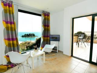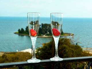 It’s all about the view! This one of a kind property measuring in total 110sqm is located right in the middle of Corfu’s best Panorama: The landmark of Corfu, the most important sight, shown in every postcard and site to define the island, Pontikonissi Island is right across! The property is built on two levels with 3 outdoor balconies and a terrace upstairs having even greater view. Each level consists of an open plan living-dining area with a fire place, a small kitchen, one master bedroom and a bathroom with shower. It has easy access by an alley with stairs going up from the main road. It is set on a plot of (approx.) 500sqm and the positioning of the property is unique. It has magnificent views at all times from every room. Right in front of you, Pontikonissi island, Kanoni area, the fortresses, the airport, Corfu Town, the sea, just everything. The landscape keeps changing, never becoming boring. It is currently operating as a holiday rental complex with excellent reviews. These two identical separated houses of 55sqm each can be easily transformed into one house of 110sqm. Located right in the middle of the island , close to all major attractions and all gorgeous beaches, west , east, north and south - Benitses (approx.) 2 km, Glyfada (approx.) 8 km , Moraitika (approx.) 4 km, Agios Gordis (approx.) 5 km. Corfu Town is (approx.) 6 km by car or 10 min walk through a pedestrian causeway /bridge connecting Perama – Kanoni.