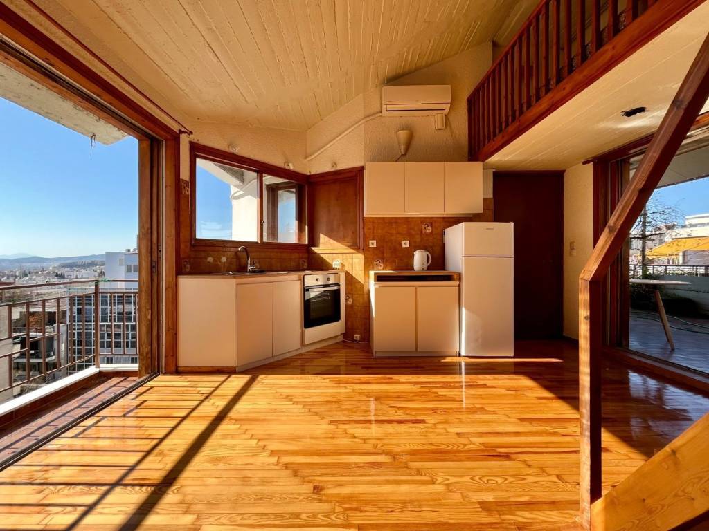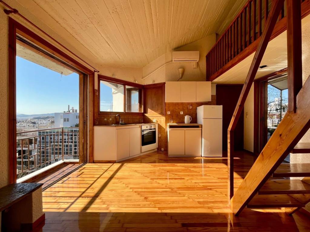 In the Pangrati area, on a side street off Filolaou Street near the First Cemetery of Athens, there is this aesthetically exceptional apartment (28 sq.m.) located on the top floor of a building with distinctive architecture. The apartment is constructed with high-quality materials. It features a large terrace with unobstructed panoramic views extending all the way to Piraeus. The apartment was fully renovated in 2023, with respect for the building’s original design and character. It is fully equipped with electrical appliances (stove, refrigerator, washing machine, air conditioner), and the bathroom is completely new. It consists of a bright, dual-aspect main living area with an open-plan kitchen and large windows, as well as an internal balcony (mezzanine) accessible via a wooden staircase, with a built-in wardrobe and its own window. Heating is provided by central natural gas.
