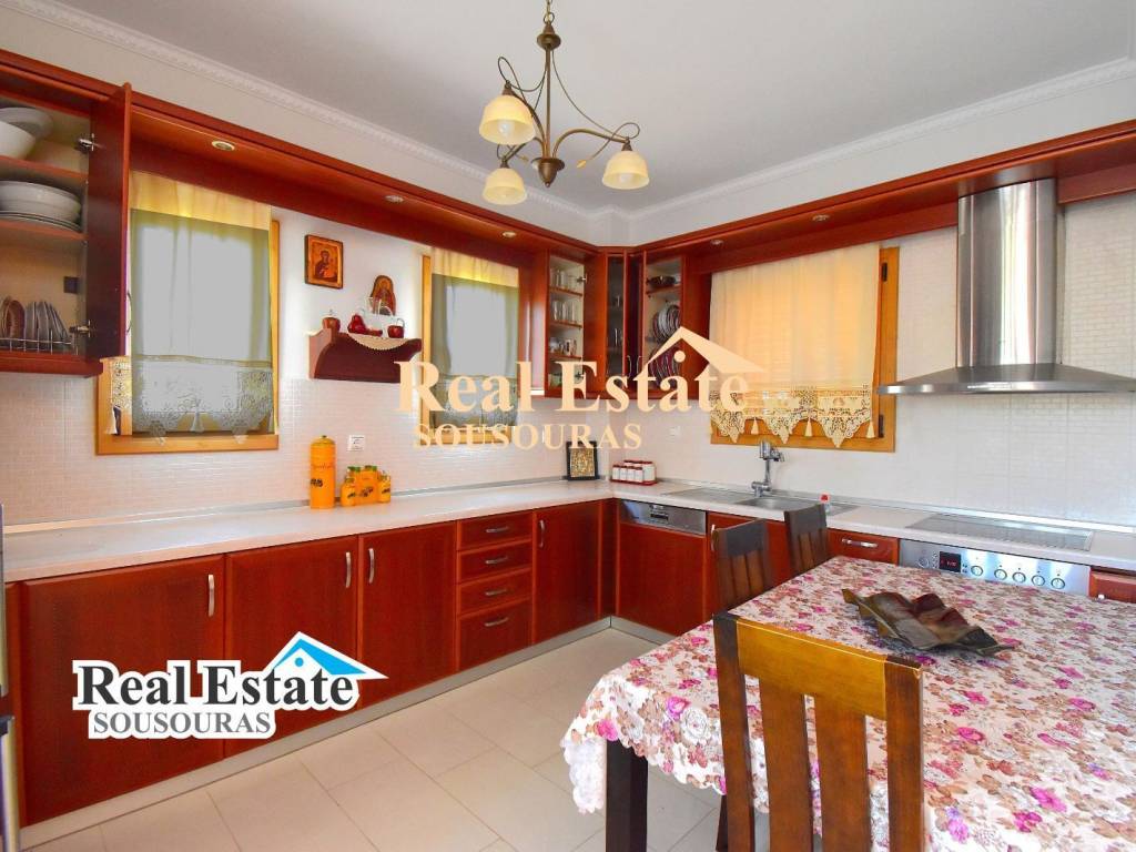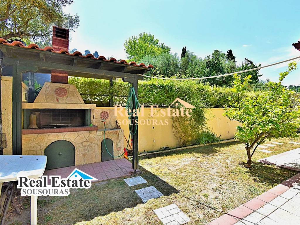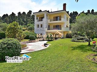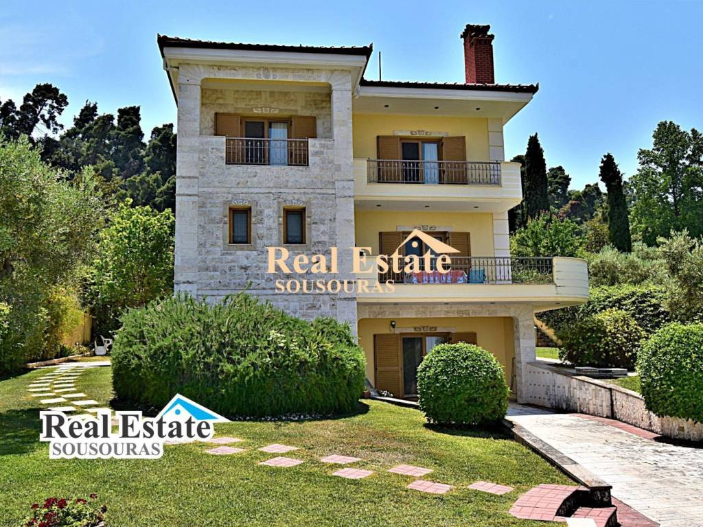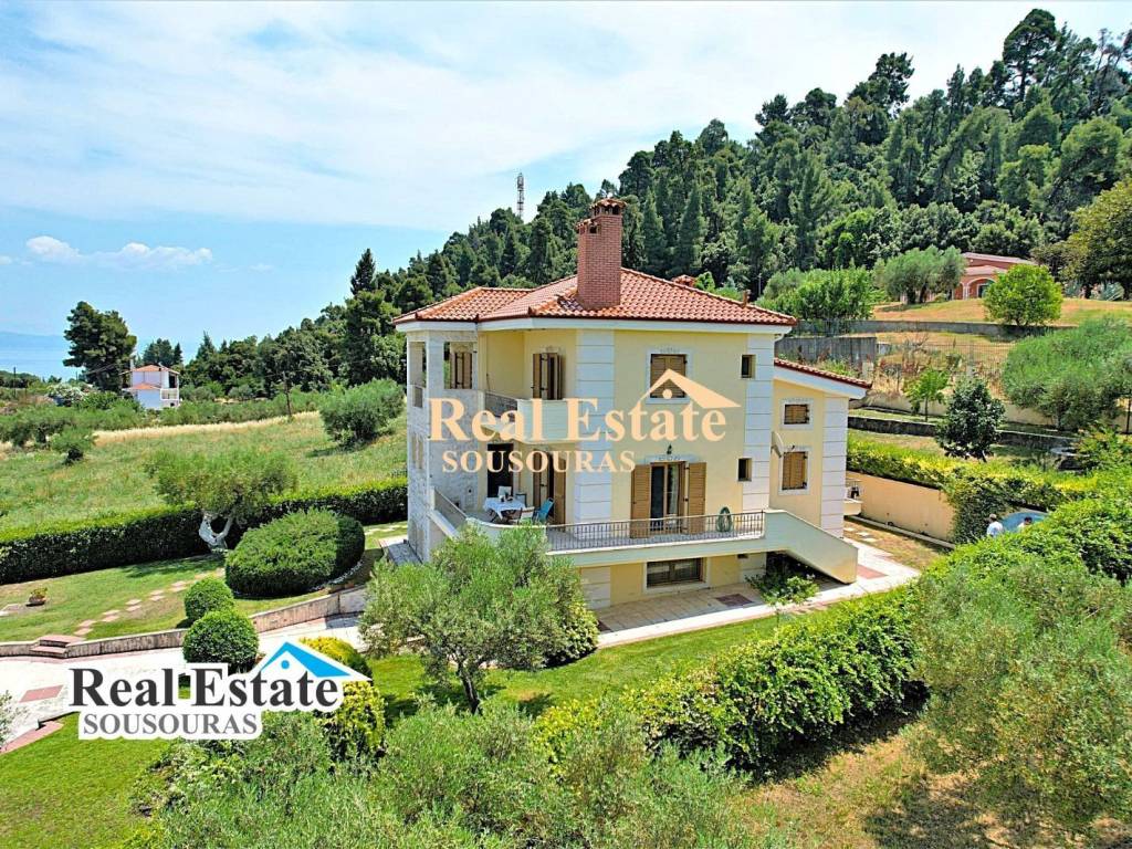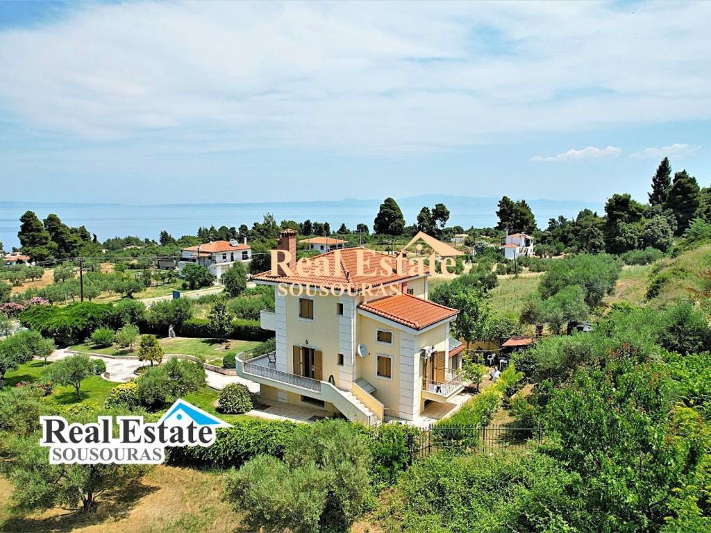 Amazing villa in an environment of unique natural beauty with a wonderful garden and incredible views. It is ideal for tourist or permanent residence, it is developed on three levels and consists of 3 bathrooms, 5 bedrooms, 2 living rooms, 2 kitchens, and a large terrace with an endless view. The ground floor can function as an independent apartment for hosting friends and the first and second floors are the main residence. It has security doors and windows, fireplace, fully furnished, air conditioning, solar water heater, individual oil heating with a boiler, a wonderful garden with large trees, BBQ, parking and an incredible view of the sea of Kassandra. It is located 300 m from the market of the settlement with cafe super market shops and taverns, 990 m from the beach, 85 km from Thessaloniki Airport and 9 km from the Hospital. For more information just call +30 6977246200, Sousouras Vasilis Halkidii Realtor.