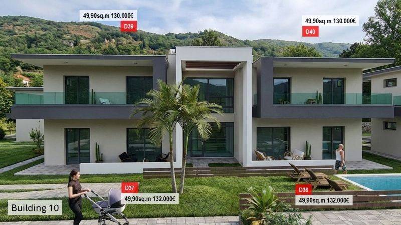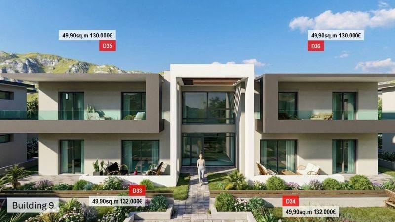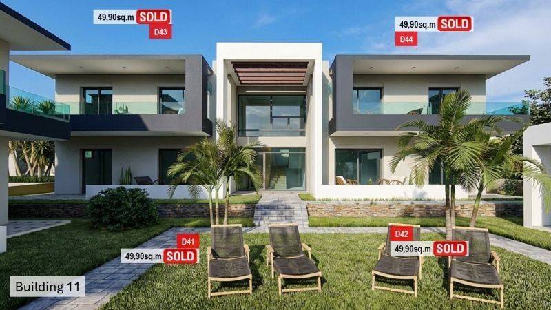 It consists of 54 residences, emphasizing modern design, within a closed fenced area providing security and tranquility. The materials and design are harmonized with the natural landscape, creating a harmonious blend between contemporary aesthetics and the traditional value of the area. Additionally, the complex has communal swimming pools, tastefully landscaped green spaces with trees and parking spaces.