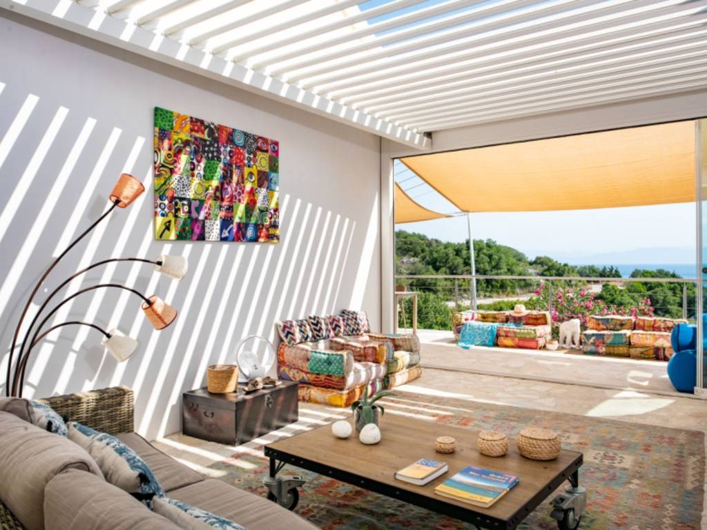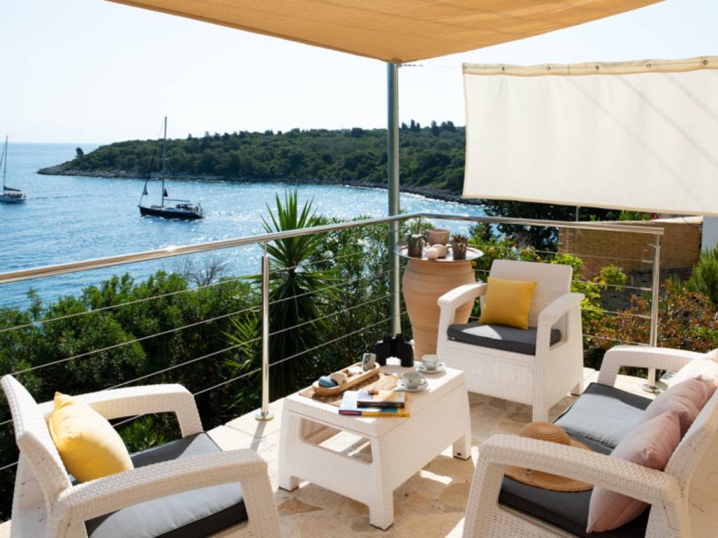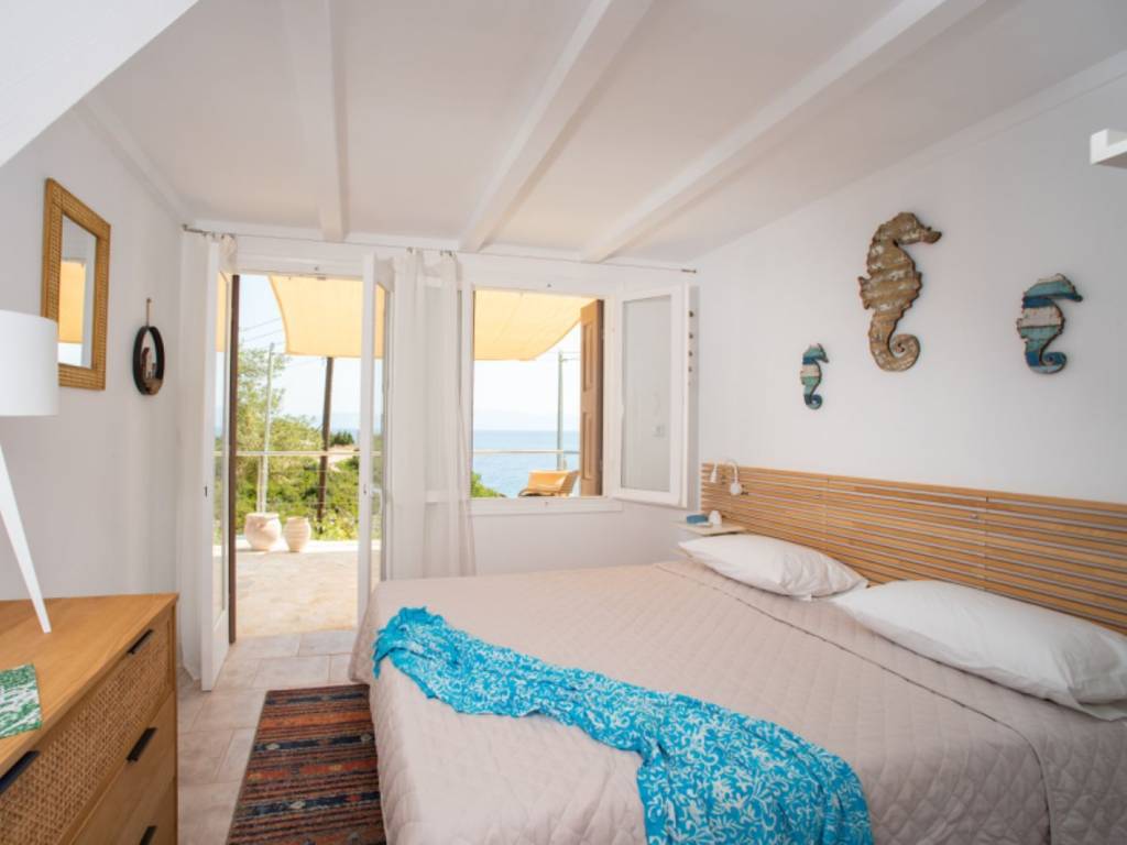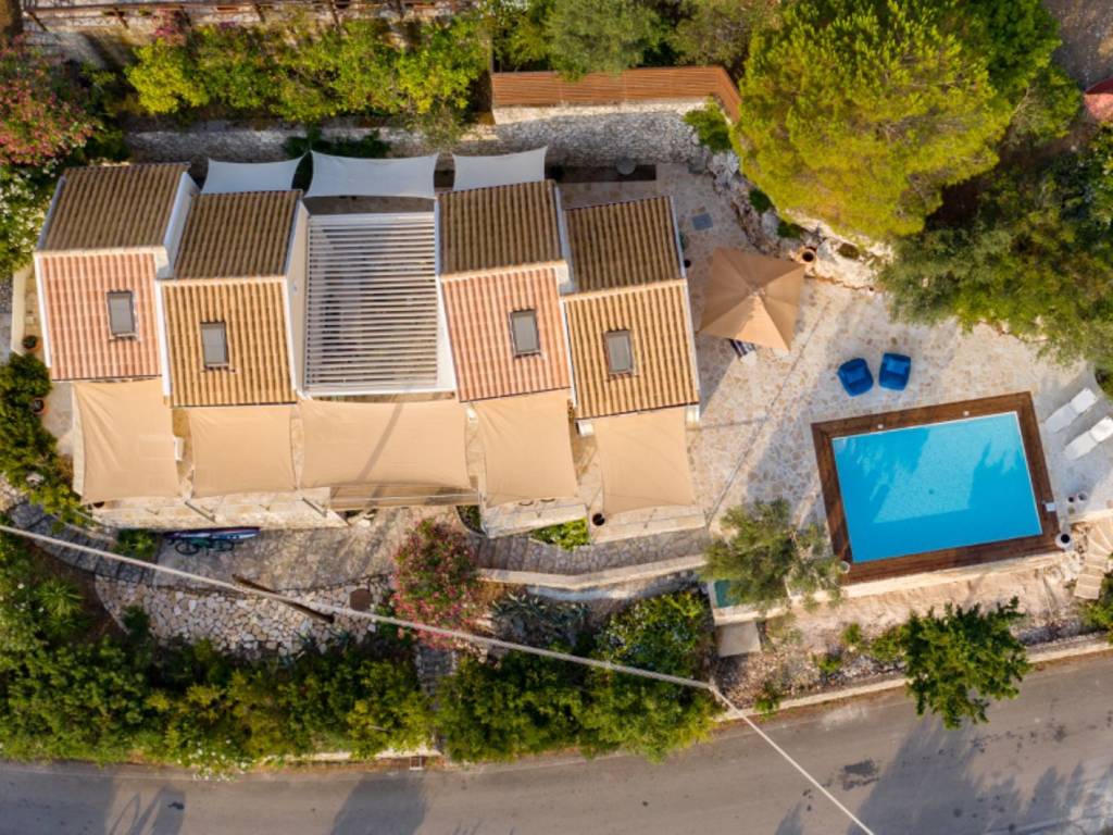 Villa Gaia is located in the Mongonissi area of Paxos, just a few steps away from a pretty beach. All on one level, the property has three double bedrooms, each one with an ensuite shower room et toilet and access to mezzanine levels. Two of the mezzanines are used as dressing areas and the third has twin beds for extra guests. All bedrooms open out to the sea view terrace. The kitchen offers all modern facilities, with access to the outdoor dining and BBQ terrace. Between the two houses there is an indoor/outdoor living room (This space can be closed or opened as desired), with floor to ceiling sliding windows looking out over the view. The pool is located at the side of the property, with ample space for lounging and taking in the beautiful scenery. Plus, you will find the air conditioning throughout the property and a private parking for two vehicles. The main island town of Gaios is less than 10 minutes away, and the picturesque bay of Mongonissi with its seaside taverna a quick drive from the villa. Thanks to its location, the view and its layout, the villa is a perfect family holiday home but also an excellent investment with very good profitability.