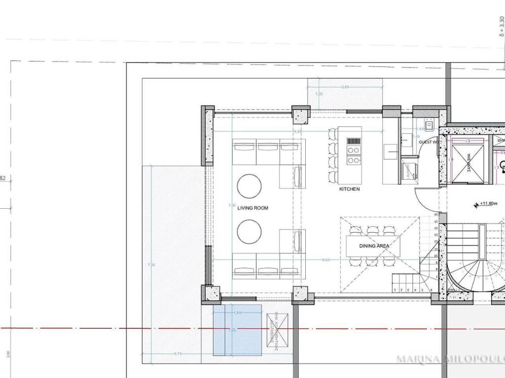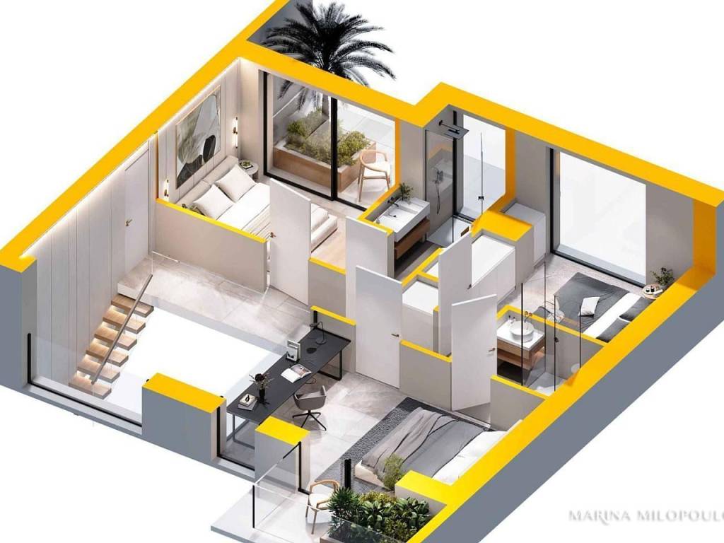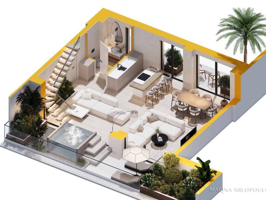 GLYFADA Ano (below Gounari Ave) in a building under construction, a 4th-5th maisonette (Loft type), 136 sqm, at the back-side of the building with South orientation. - 4th floor, 71 sqm, reception erea (double height) - dining area, open plan kitchen, 1 wc and 2 verandas with sea and mountain view. On the large South veranda the pool (3,5 sqm) - 5th floor (Loft), 65 sqm, 3 bedrooms (1 master with veranda with mountain view), 1 additional bathroom and one veranda with sea view. It is part of a modern 5-storey corner building with a total of 12 properties. It features air conditioning, underfloor heating, thermal break energy windows, hybrid solar panels for hot water, basement parking space and storage. Zone price €2350. It is located very close to a local market, 2.2 km from the Elliniko metro station and the shopping area of Glyfada, 3 km from the beach of Glyfada, 3.5 km from the Ellinikon Metropolitan Park and 26 km from the Intern airport. Estimated delivery 12/2026.
