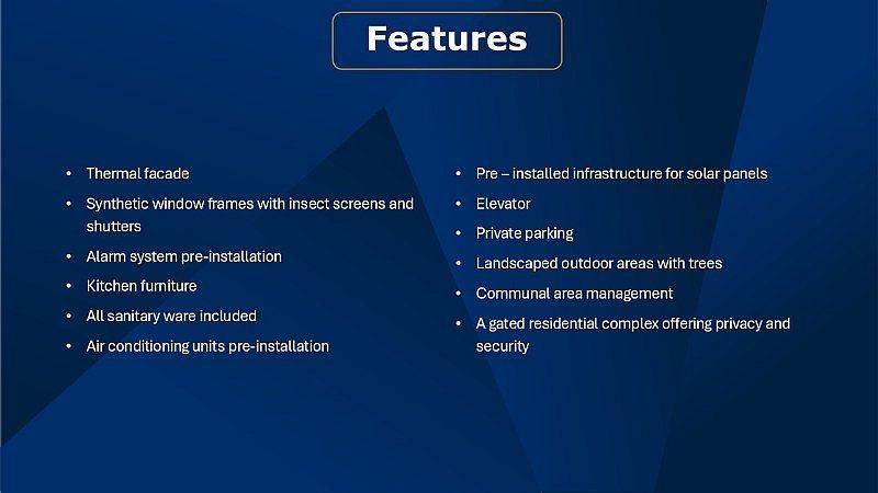 Το συγκρότημα αποτελείται από 12 κομψά κτίρια, με διαμερίσματα που συνδυάζουν ευρυχωρία και φυσικό φως. Οι μεγάλοι, ανοιχτοί χώροι και οι βεράντες με την ανεμπόδιστη θέα ενισχύουν την αίσθηση της ιδιωτικότητας και της ηρεμίας, ενώ οι ανελκυστήρες διευκολύνουν την καθημερινότητα, κάνοντάς το ιδανικό για κάθε ηλικία.