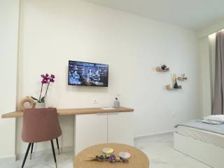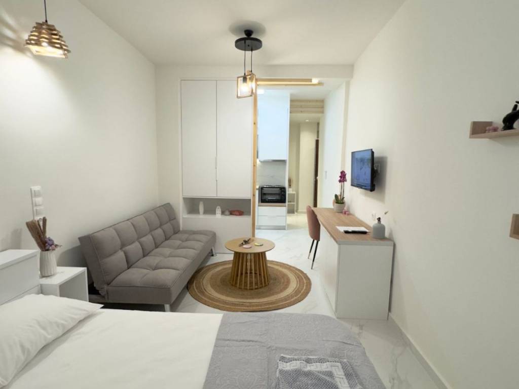 Studio meublé, avec électroménager, vaisselle, casseroles, etc., bureau, Internet, partagé, EYDAP, sans balcon mais avec une fenêtre que nous avons agrandie pour étendre le linge. Seule l'électricité n'est pas incluse dans le prix. Le linge de lit est fourni si besoin.