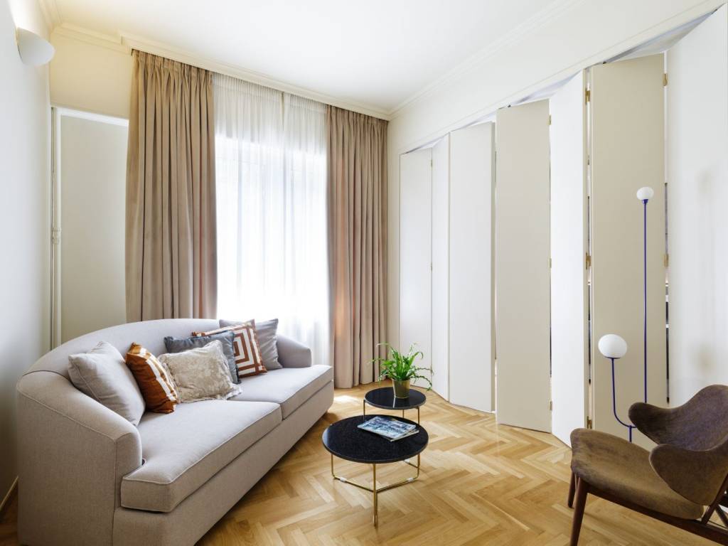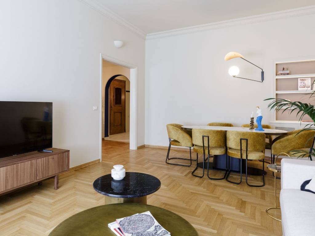 Σε αρχοντική πολυκατοικία των Ανακτόρων, σε ήσυχο δρόμο, διατίθεται ψηλοτάβανο διαμέρισμα 105 τ.μ. με δρύινα πατώματα και θυρωρό. Έχει υποστεί ολική ανακαίνιση το 2019 με καινούρια υδραυλικά και ηλεκτρολογικά, ενεργειακά και ηχομονωτικά κουφώματα με ηλεκτρικά ρολά, νέο μπάνιο και κουζίνα, συναγερμό, κλιματιστικά Α++ με Wi-Fi και μοναδικό design με έργα τέχνης. Είναι πλήρως επιπλωμένο με ολοκαίνουριες ηλεκτρικές συσκευές, μεταξύ των οποίων πλυντήριο/στεγνωτήριο, πλυντήριο πιάτων, φούρνος μικροκυμάτων, ψυγείο, ηλεκτρική κουζίνα, μηχανή Nespresso και vintage βραστήρας. Διαθέτει δύο υπνοδωμάτια, δύο μπάνια και μπορεί να φιλοξενήσει έως έξι άτομα. Το σαλόνι είναι άνετο, με καναπέδες και Smart TV, ενώ το διαμέρισμα είναι πλήρως μονωμένο θερμικά και ακουστικά. Διατίθεται για μακροχρόνια και βραχυχρόνια μίσθωση, κατάλληλο και για επαγγελματική χρήση. Τιμή 2.700 € τον μήνα. Διαθεσιμο απο 1/4/2026