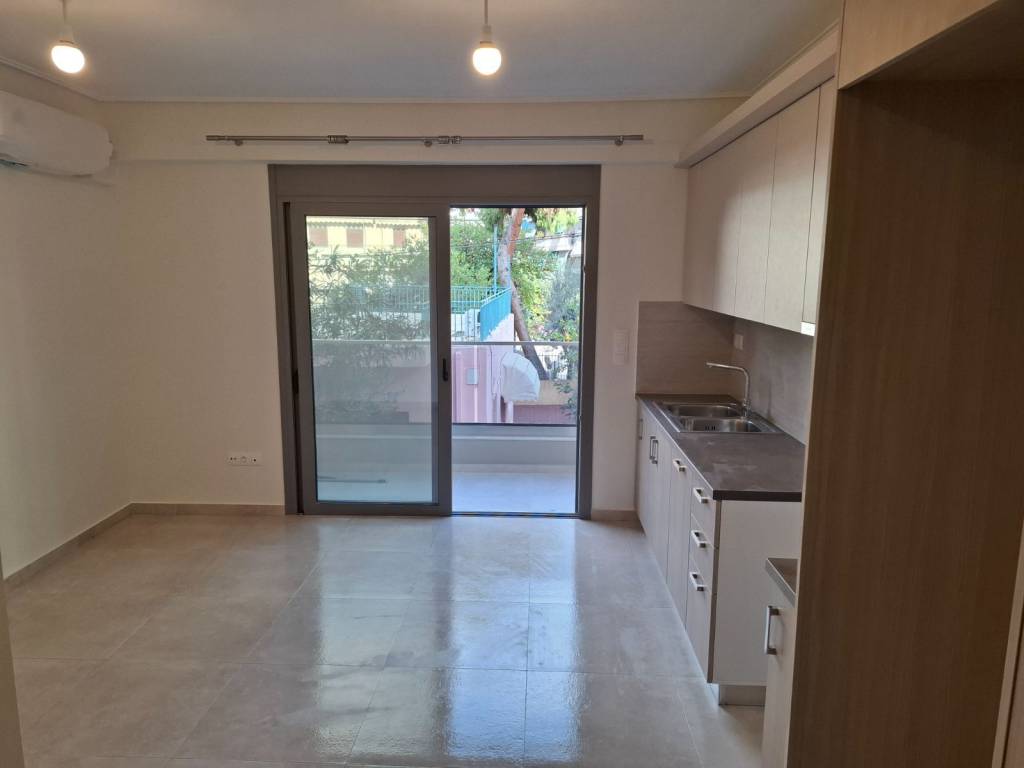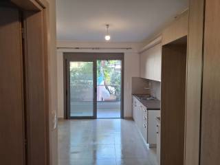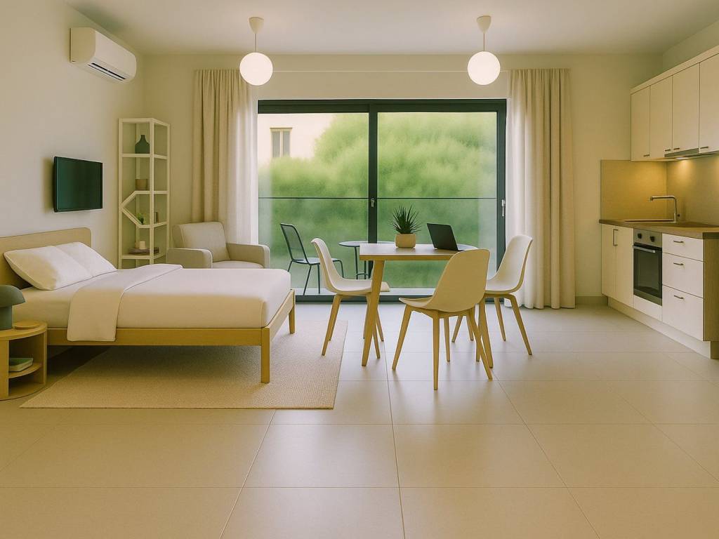 Brand-new A+ energy-rated apartment (2025) in Ano Ilisia, first occupancy. Within walking distance of the University Campus, Ilisia Park, the swimming center, local market and public transport. Low energy costs (external insulation, solar water heater, energy-efficient windows). Features: Wi-Fi A/C, electric shutter, insect screens, enhanced sound insulation, fire detection, security system with remote access. Image is a digital rendering.
