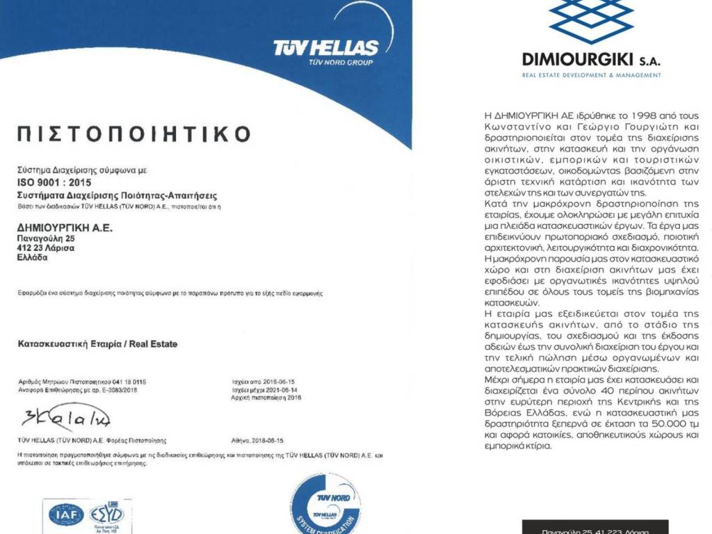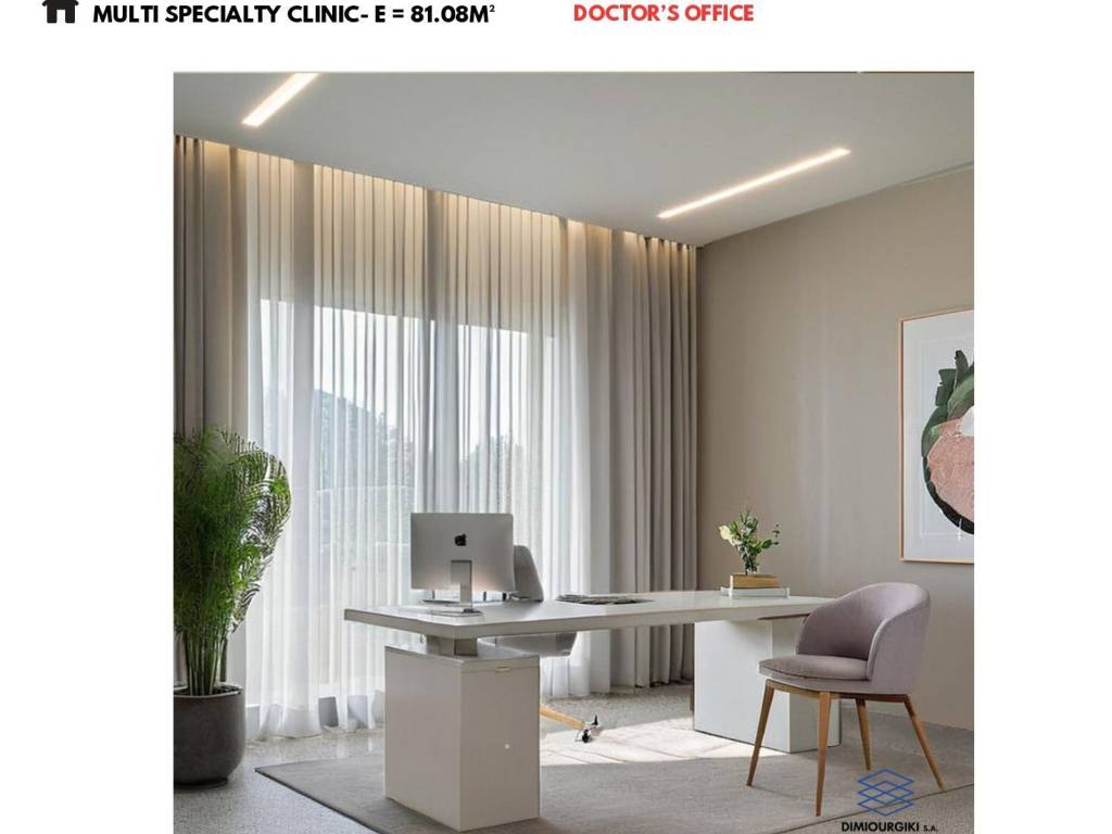 Πολυτελές ιατρείο, οροφοδιαμέρισμα σε τριώροφο ανακαινισμένο συγκρότημα ιατρείων, χαρακτηρισμένο στην οικοδομική άδεια ως ιατρεία/γραφεία, ώστε οι ιδιοκτήτες του να προσφέρουν υπηρεσίες υγείας. Το κτίριο θα αποτελεί το μοναδικό συγκρότημα στην πόλης της Λάρισας αποκλειστικά ιατρικών και παρεμφερών υπηρεσιών . Βρίσκεται στο κέντρο της Λάρισας επί της οδού Παναγούλη αριθμ. 54, με προνομιακό προσανατολισμό. Έχει καθαρή επιφάνεια 81,21 τ.μ., 1ου ορόφου, διαμπερές, με εξώστη στην οδό Παναγούλη. Το ιατρείο αποτελείται από χώρο υποδοχής- σαλόνι, γραφείο, δύο χώρους εξέτασης ασθενών, κουζίνα, μπάνιο και WC . H οικοδομή είναι Α ενεργειακής κλάσης, η δε θέρμανση με ατομικό λέβητα φυσικού αερίου . Το κτίριο είναι έργο της εταιρίας ΔΗΜΙΟΥΡΓΙΚΗ ΑΕ. Κατά την μακρόχρονη δραστηριοποίηση της, η εταιρία έχει ολοκληρώσει με μεγάλη επιτυχία μια πλειάδα κατασκευαστικών έργων, με πρωτοποριακό σχεδιασμό, ποιοτική αρχιτεκτονική, λειτουργικότητα και διαχρονικότητα, οικοδομώντας βασιζόμενη στην άριστη τεχνική κατάρτιση και ικανότητα των στελεχών της και των συνεργατών της .