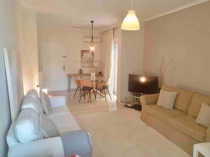 Voula, 60m² furnished one-bedroom apartment. *Bills included except ΔΕΗ(electricity) Elegant apartment in Voula, 50 meters from the sea, close to the center of Voula, a large suburb of Athens. The apartment is located in a quiet, family building and has a nice view of the garden and quiet street and close to the center of Voula and the beach. Only half an hour from the city center and a few minutes by car from the shopping and entertainment center of Glyfada.