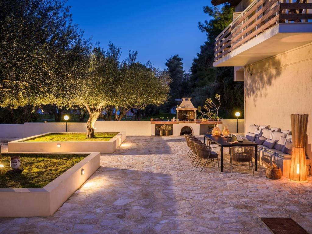 The lower level of the villa features a spacious one-bedroom suite, designed for comfort and privacy. This inviting space offers a modern en-suite bathroom, a cozy living area, a fully equipped kitchen, and convenient access to the outdoor garden. Perfect for relaxation or hosting guests, it provides a tranquil retreat within the villa’s luxurious setting. Guest Houses: Four separate guest houses, one two-bedroom and tree more one-bedroom ideal for guests seeking refined elegance and tranquility, these sleek, spacious suites offer a perfect retreat. Each with an open-plan design, combined with a private veranda overlooking a peaceful olive grove, create an inviting space for relaxation and outdoor enjoyment. With a minimalist style and thoughtful amenities, promise a serene escape filled with comfort and joy. Additional benefit: An 80m² building requiring complete renovation to be converted into two separate suites. Fitted with modern comforts, Villa Amoret is a haven for life’s pleasures. Designed for families or groups of friends, it features four double bedrooms, three on the ground floor, one upstairs, three bathrooms, an additional WC, three living rooms, a dining area, and a fully equipped kitchen. The main living room, with its classic charm, boasts a cozy fireplace and a charming secretary, inviting comfort and elegance. Embracing outdoor living, Villa Amoret features spacious terraces, secluded corners, and expansive gathering areas, including an outdoor dining area with a BBQ and stunning sea views, creating the perfect setting for relaxation, socializing, and enjoying the beautiful surroundings. Whether seeking quiet reflection or lively moments, this villa embodies a sense of indulgence. Immerse yourself in its luxurious embrace, as Villa Amoret becomes your tranquil retreat, promising an unforgettable Kefalonian escape.