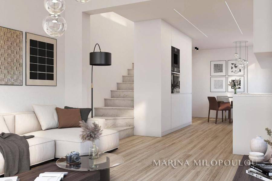 VARI - Miladeza, an under construction maisonette (Loft type, 3 levels, Ground floor - 1st - Basement, total area 126 sq m with garden and elevator. - Ground floor, 41.5 sq m, reception area, dining room, open kitchen, wc. Direct access to the garden 108 sq m - Basement, 39.5 sq m, playroom / guest room, 1 bathroom, natural lighting from cour-anglaise. - 1st floor (loft type), 45 sq m, 1 bedroom, 1 office and 1 bathroom. It is part of a complex with 2 identical attached maisonettes, energy class A+ It has a heat pump, photovoltaic panels for electricity production, an underground storage room, a parking space in the garden, where there is also a supply for a jacuzzi tab. Zone price 1500€. It is located 1.7 km from Evelpidon Avenue and Vari's market, 2.2 km from "Varkiza Resort" beach and the center of Varkiza with cafes - restaurants and 19 km from the intern. airport. Estimated delivery 12/2026.
